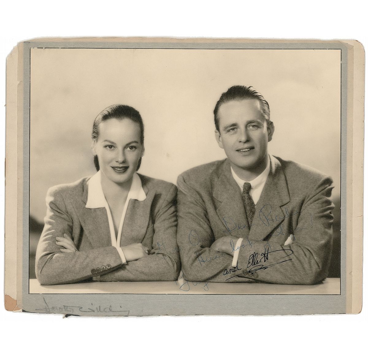 Son of Franklin and Eleanor Roosevelt (1910–1990). Vintage matte-finish 11.25 x 9 photo of Roosevelt and his wife, actress Faye Emerson, signed and inscribed in blue ballpoint by Emerson to gossip columnist Radie Harris, “For our dear Radie, Here’s looking at you! Faye,” and “in fountain pen, “and Elliott.” Photo is affixed to a slightly larger mount, which is signed in pencil by the photographer, Dorothy Wilding. In fine condition, with trimmed edges, and some light contrast to Faye’s signature and inscription.