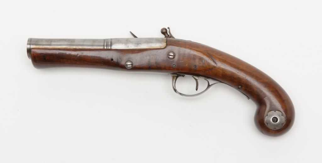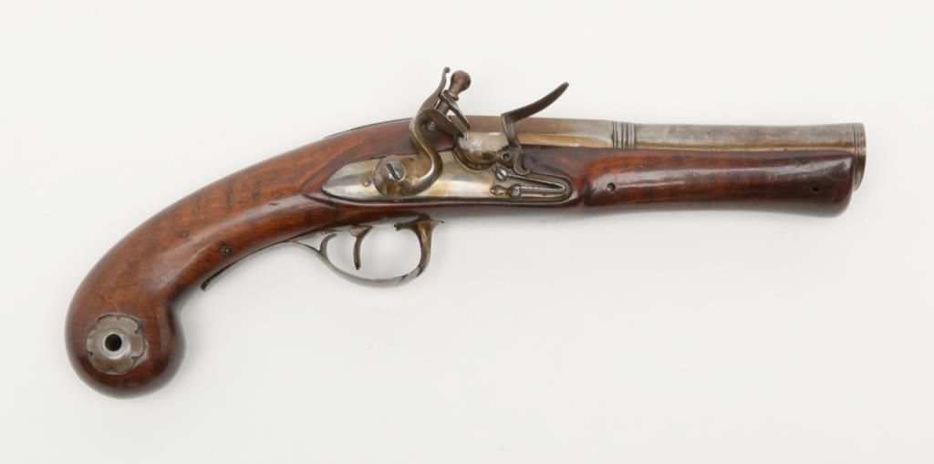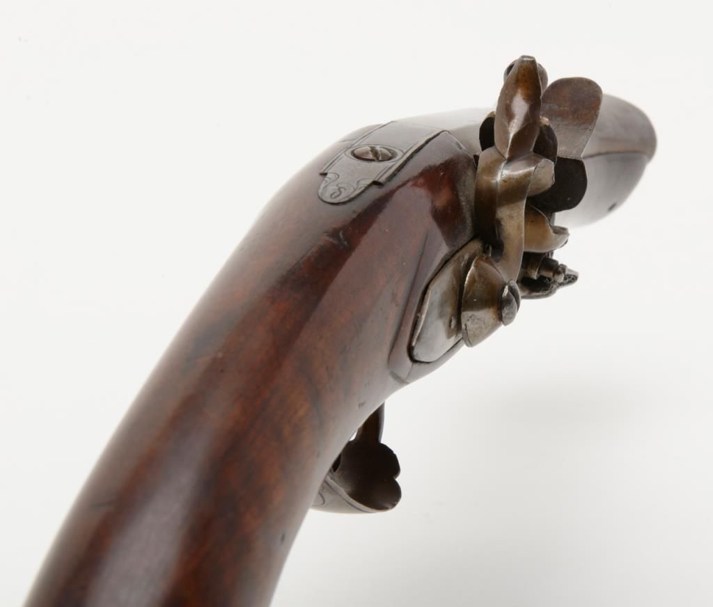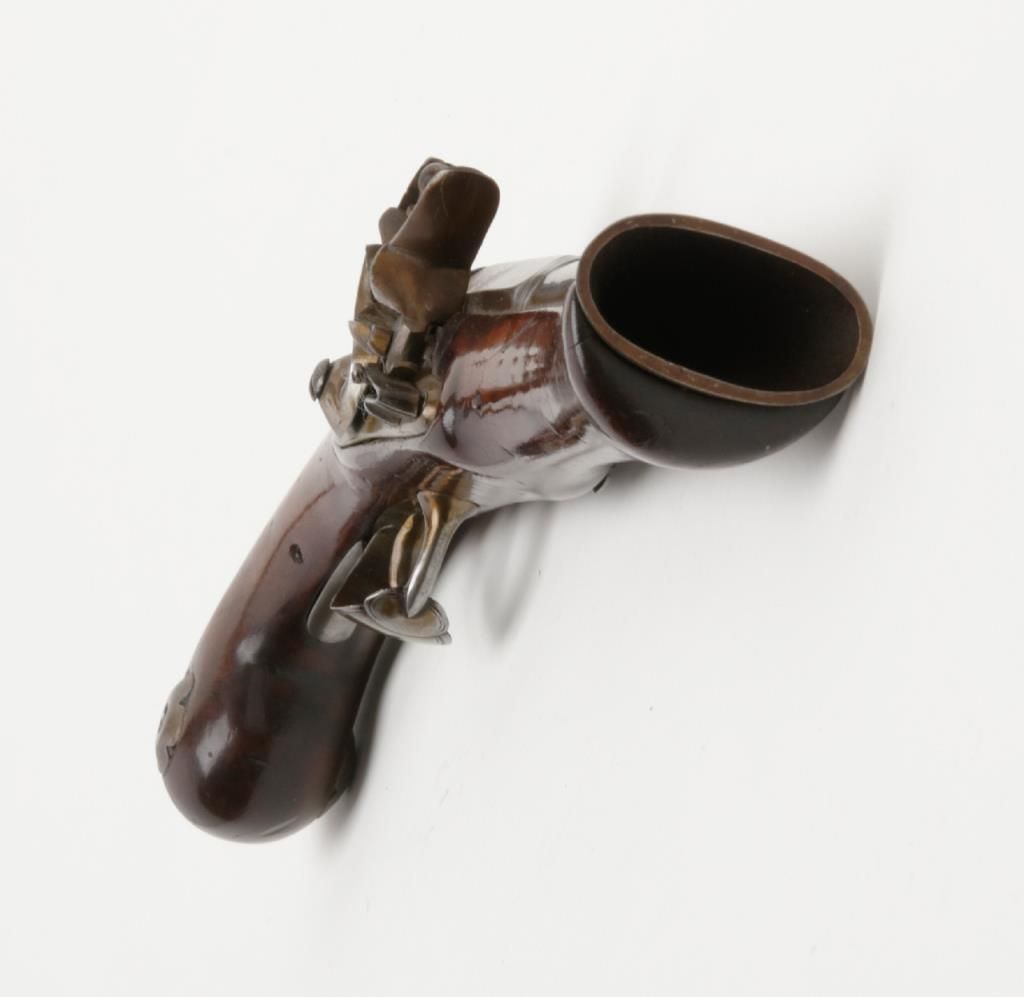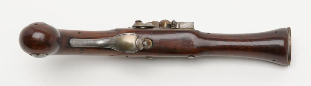 Elliptical barrel blunderbuss pistol circa early 19th century with iron barrel and mounts probably French but unmarked. The pistol measures 13 ½” overall with 6 ¾” barrel that measures nearly 2” across its flared mouth. The metal surfaces show a gray to brown patina finish with traces of original stripping pattern finish on the barrel. The lock is in its original flintlock configuration with correct hammer and small parts. The pistol shows an unusual possible periodrestock with an elongated grip and the addition of a metal fixture for accepting a lanyard or cord to hang the pistol from. The stock is definitely of the period of 19th century and in very good condition showing a light coating of a latervarnish. Blunderbuss pistols are always scarce but particularly with elliptical barrels. Est.: $1750-$3500