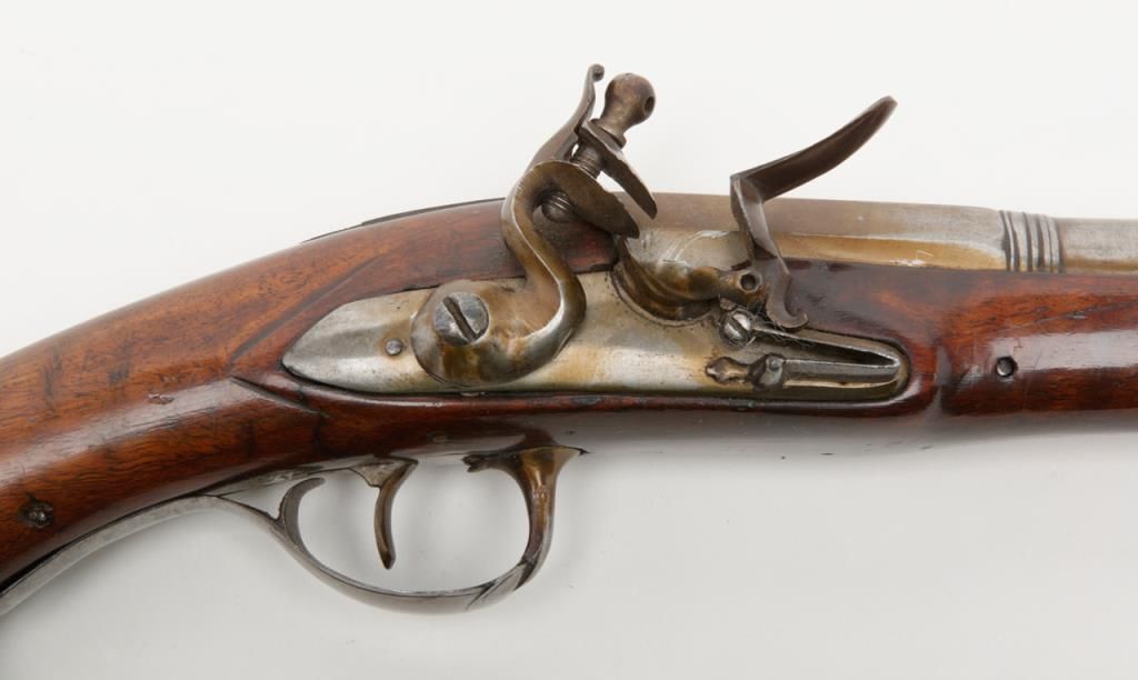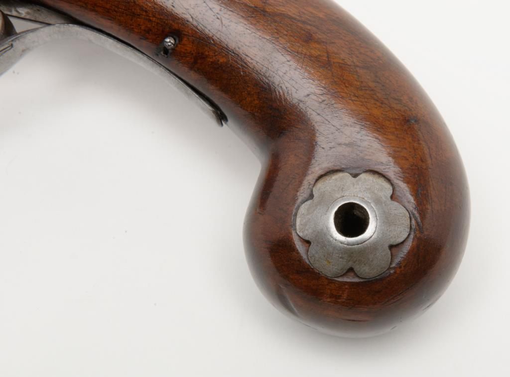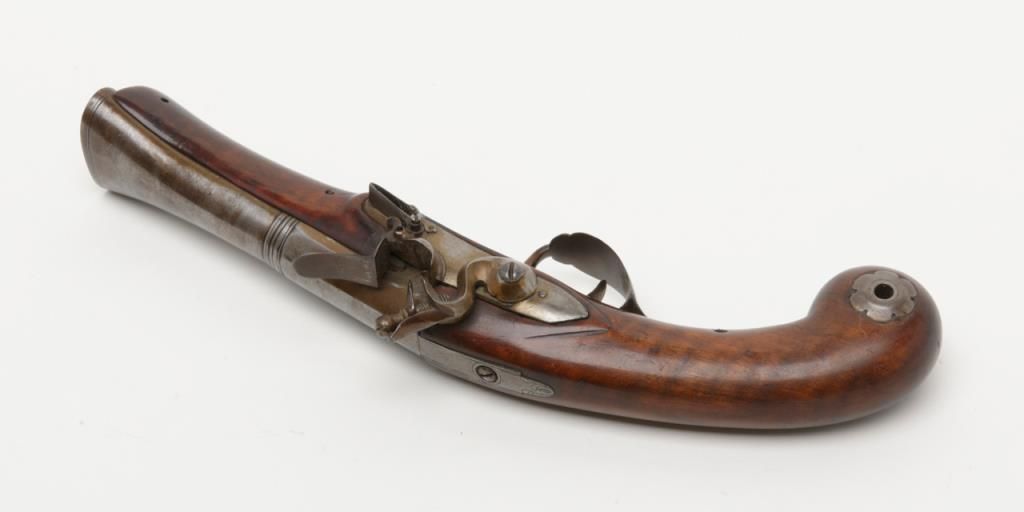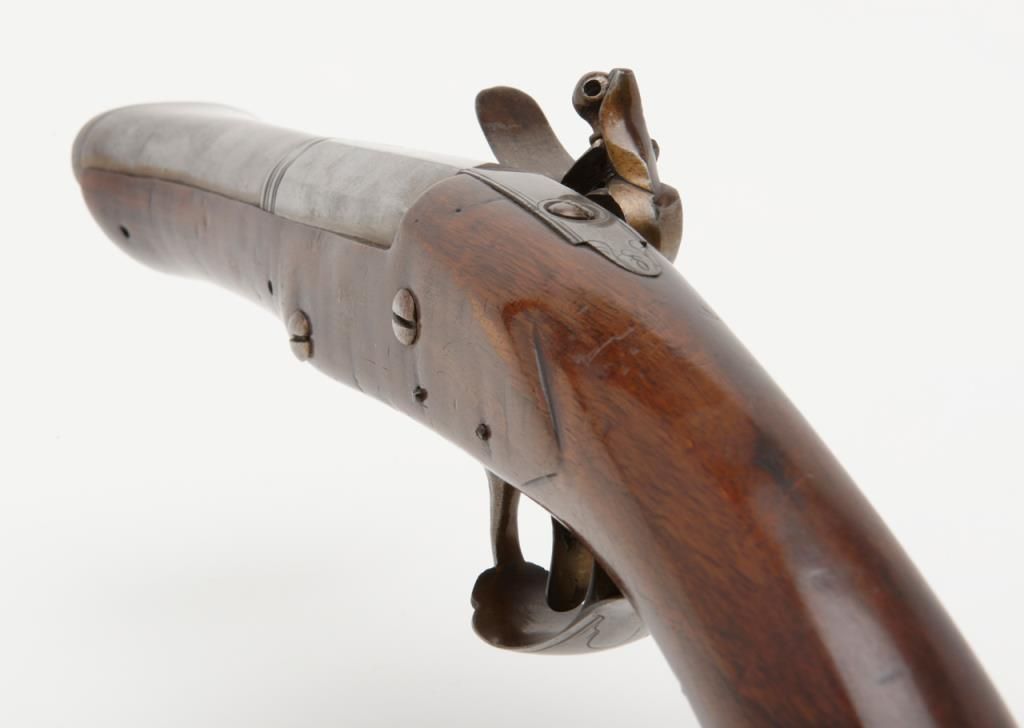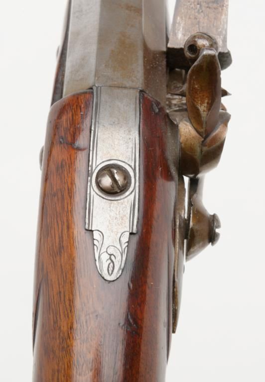 Elliptical barrel blunderbuss pistol circa early 19th century with iron barrel and mounts probably French but unmarked. The pistol measures 13 ½” overall with 6 ¾” barrel that measures nearly 2” across its flared mouth. The metal surfaces show a gray to brown patina finish with traces of original stripping pattern finish on the barrel. The lock is in its original flintlock configuration with correct hammer and small parts. The pistol shows an unusual possible periodrestock with an elongated grip and the addition of a metal fixture for accepting a lanyard or cord to hang the pistol from. The stock is definitely of the period of 19th century and in very good condition showing a light coating of a latervarnish. Blunderbuss pistols are always scarce but particularly with elliptical barrels. Est.: $1750-$3500