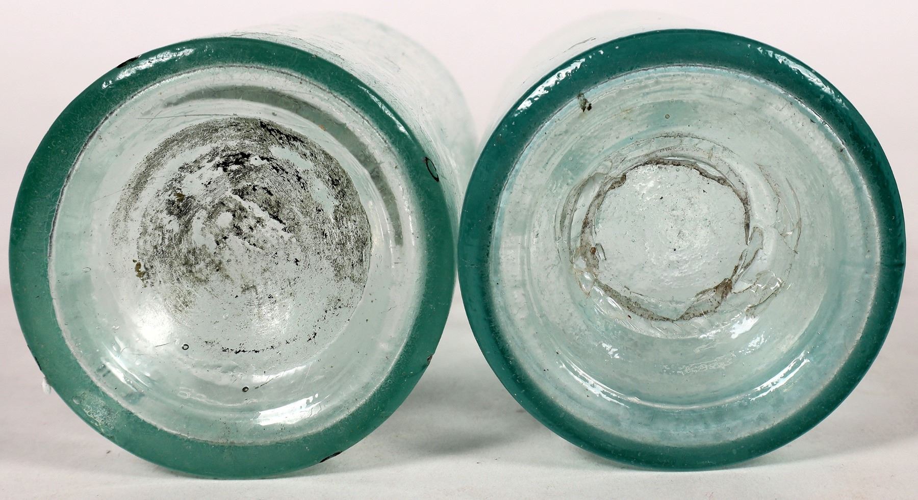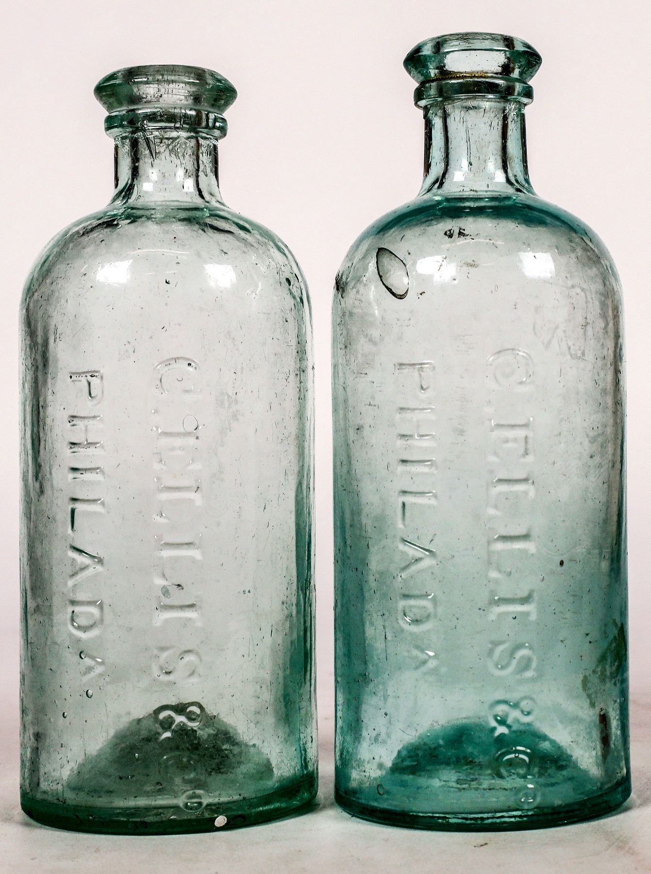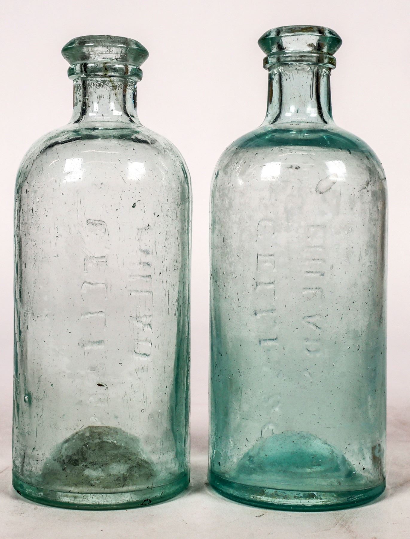 Ellis & Co Philadelphia Citrate Pair with identical embossing double ring top one is 7" open pontil the other is graphite 6 3/4" Ron Reed Collection