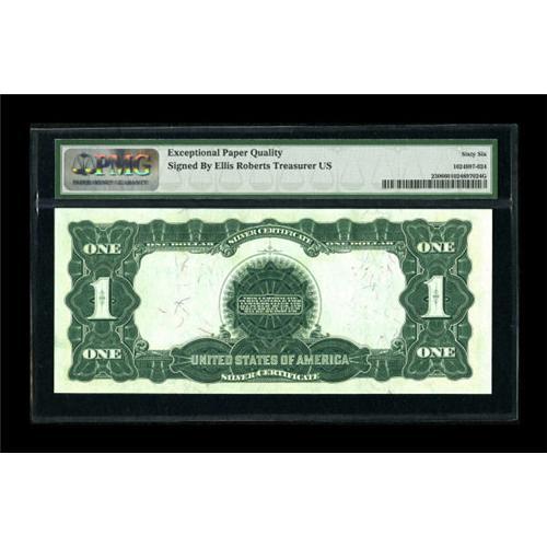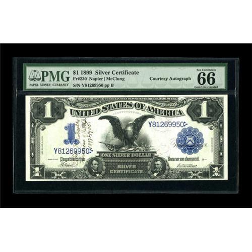 <B>Ellis H. Roberts Courtesy Autograph Fr. 230 $1 1899 Silver Certificate PMG Gem Uncirculated 66 EPQ.</B></I> The four Fr. 230s that we have in this auction and are autographed by Roberts are all consecutive notes and they could also be used to rebuild a cut sheet. This Friedberg number does not have a Roberts engraved signature, but according to the census, this lot is one of only four notes of this Friedberg number that Roberts signed. This is the plate letter B note.<BR><BR><b>Shipping:</b> Coins & Currency (<a target="_blank" href="http://www.heritageauctions.com/common/shipping.php">view shipping information</a>)
