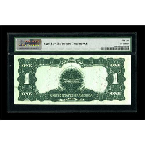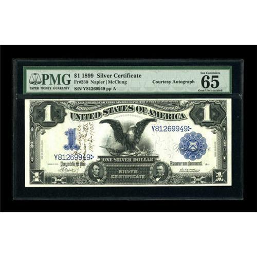 <B>Ellis H. Roberts Courtesy Autograph Fr. 230 $1 1899 Silver Certificate PMG Gem Uncirculated 65.</B></I> This plate letter A Black Eagle that does not have his engraved signature was signed by Ellis H. Roberts with the added lines of "Treasurer of the U.S. 1897 - 1905." Serial number embossing is evident on this note. Roberts signed only four notes of this Friedberg number and all four of those notes are in this auction.<BR><BR><b>Shipping:</b> Coins & Currency (<a target="_blank" href="http://www.heritageauctions.com/common/shipping.php">view shipping information</a>)
