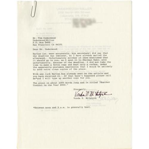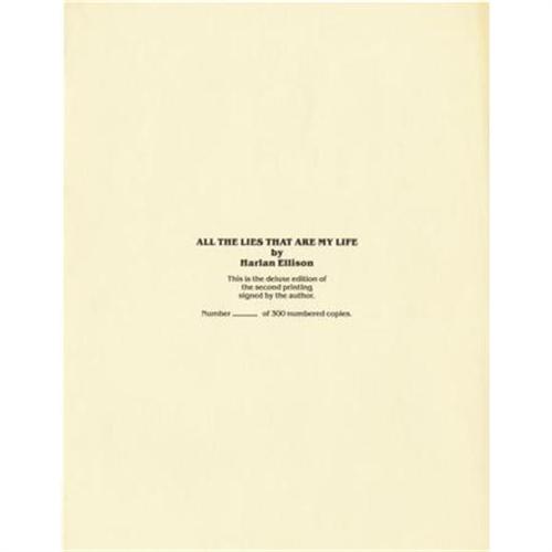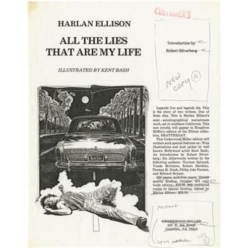 <B>Harlan Ellison: Production Archive for <I>All The Lies That Are My Life</B></I></B></I> (San Francisco, California & Columbia, Pennsylvania: Underwood-Miller, Inc., 1980). Harlan Ellison published a limited edition of <I>All the Lies That Are My Life</B></I> in 1980, and again in 1989. This archive includes a plethora of material used in the planning, production, and publication of the book at both times. Included here are the following:<BR><B>Proof of the Original Dust Jacket,</B></I> measures 20.5" x 9.5".<BR><B>Copies of Advertisements</B></I> for the book in various states of editing.<BR><B>Several States of the Colophon Page</B></I> with holographic notations, presumably in Ellison's hand.<BR><B>Letters Between Ellison and the Publishers,</B></I> one signed "<I>Harlan</B></I>", several signed "<I>Tim</B></I>" or "<I>Tim Underwood</B></I>", one signed "<I>Chuck</B></I>" by Chuck Miller. Also includes a four page handwritten letter from Chuck Miller to Ellison.<BR><B>Typescripts of the Introductions,</B></I> including copies of typescripts from Edward Bryant, Vonda McIntyre (with TLS), Robert Silverberg (with cover letter signed "<I>Bob</B></I>"), Thomas Disch, and Robert Sheckley.<BR><B>Letter of Provenance</B></I> for the collection signed by Chuck Miller. A one of a kind collection of material revealing the behind the scenes world of book production.<BR><BR><b>Shipping:</b> Flat Material, Small (<a target="_blank" href="http://www.heritageauctions.com/common/shipping.php">view shipping information</a>)