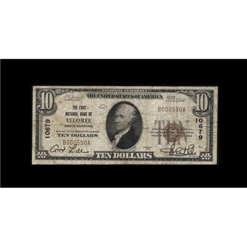 <B>Elloree, SC</B></I> - $10 1929 Ty. 1 <B>The First NB </B></I> Ch. # 10679<BR>Small notes from here are scarcer than large. This institution closed in 1931 after having issued only $10 Date Backs and Plain Backs as well as the $10 1929 Type 1, four of which are documented. Tonight's example is <B>Fine.</B></I> We sold an About Fine in our January 2004 Florida United Numismatists Sale for $701.50. This offering should surpass that by at least a bit.