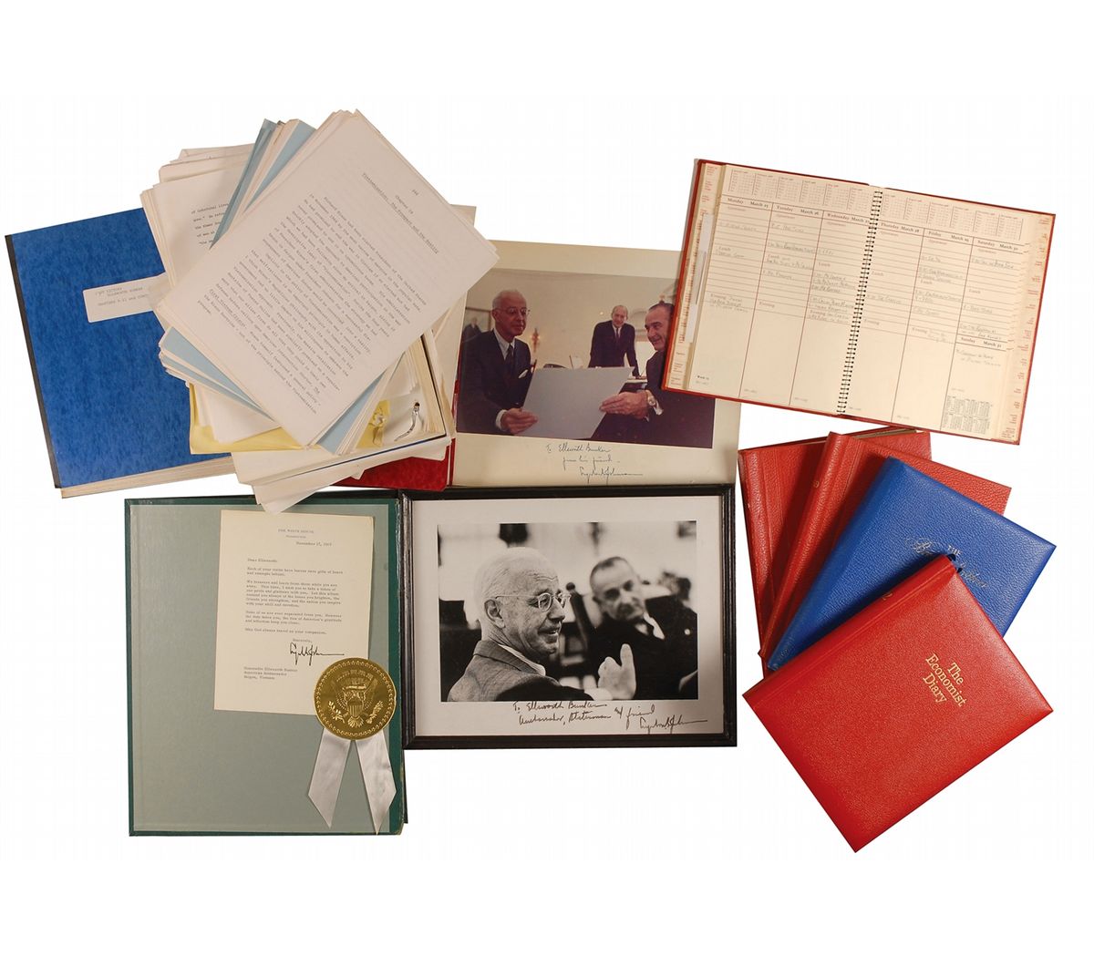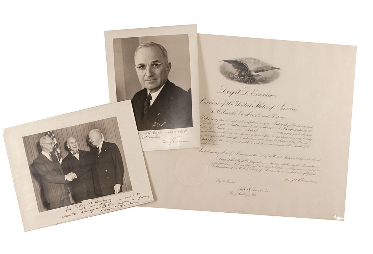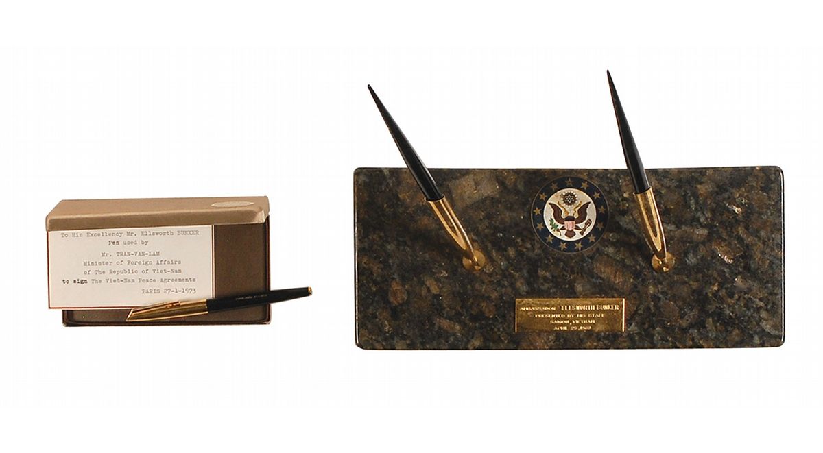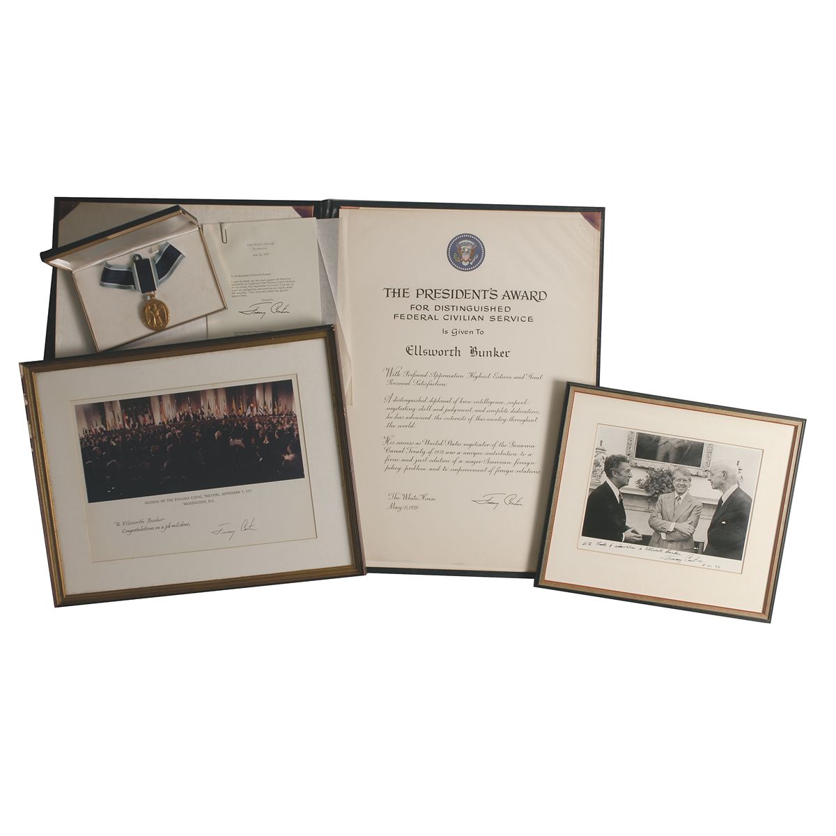 Ellsworth Bunker (1894–1984), who served the US in various capacities under seven presidents, was without a doubt one of the most important American diplomats of the 20th century. His highly regarded skill as a worldwide troubleshooter landed him in the middle of some of the most politically complex situations of our time—most notably as ambassador to wartime South Vietnam, from 1967 to 1973. Bunker made other significant contributions as ambassador to India under Eisenhower, and in drawing up the Panama Canal treaties under Carter. For these efforts, he was twice awarded the Presidential Medal of Freedom with Distinction—one of which is included in this collection. Other significant items in the sale of the Bunker Archive are a pen used to sign the Paris Peace Accords, the flag flown over the United States Embassy in Saigon on the day the cease fire took effect, drafts of Bunker’s unpublished autobiography, presidential signed photos, and an extensive assortment of medals, awards, and private papers. All items seen below are included in the single-lot sale of the Bunker Archive, and are arranged chronologically.