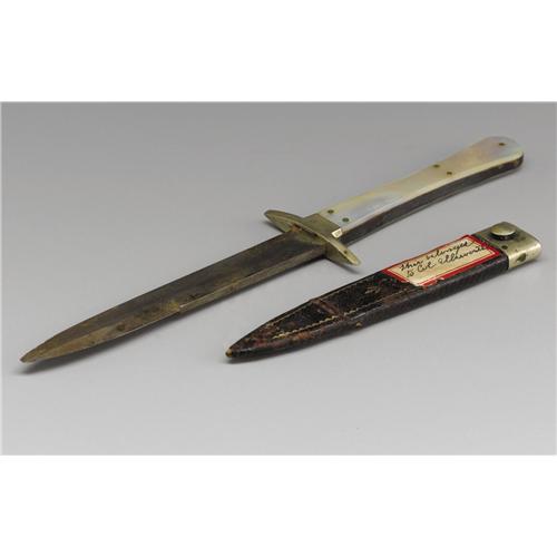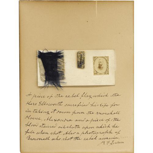 <B>Important Colonel Elmer Ellsworth Group</B></I> consisting of an antique framed collection of relics and a Sheffield side knife that belonged to the colonel. A late 19th century wooden frame, 7.5" x 9.5", houses a 1" x 2" flag swatch, a .5" x .75" silver of oil cloth and a gem-sized albumen print. These items are placed above an explanatory inscription reading, "<I>A piece if the rebel flag which the hero Ellsworth sacrificed his life for in taking it down from the Marshall House, Alexandria and a piece of the blood stained oil cloth upon which he fell when shot. Also a photograph of Brownell who shot the rebel assassin. B.F. Jerome</B></I>". The flag fragment, being blue, indicates that it was cut from the canton of Jackson's First National Confederate banner. Light even browning on paper items, else fine condition; Sheffield side knife with leather sheath, 8.5" long overall with 4.75" blade. Mother-of-pearl hilt having inlaid German silver panel engraved ELLSWORTH. All affixed to German silver crossguard over a steel blade stamped with obscure maker's name and SHEFFIELD. The sheath has a German silver throat and has an early label inscribed, "<I>this belonged to Col Ellsworth.</B></I> The blade is missing its very tip, light rusting and wear to sheath. Overall very good condition. Yankee troops first entered the Confederacy proper at Alexandria, Virginia on May 24, 1861 counting on an easy jaunt down to Richmond. The dashing Elmer Ellsworth and his New York Fire Zouaves of the 11th NY Volunteers were among the invading forces. Ellsworth, while removing a Confederate flag from the Marshall House, was shot dead by James Jackson, the proprietor. Jackson was in turn gunned down by Private Francis Brownell. The Northern public made Ellsworth a martyr, Jackson a villain and Brownell a hero. The flag that started it all ended up in President Lincoln's possession since he had been a great champion of Ellsworth's.<BR><BR><b>Shipping:</b> Small Collectibles (<a target="_blank" href="http://www.heritageauctions.com/common/shipping.php">view shipping information</a>)