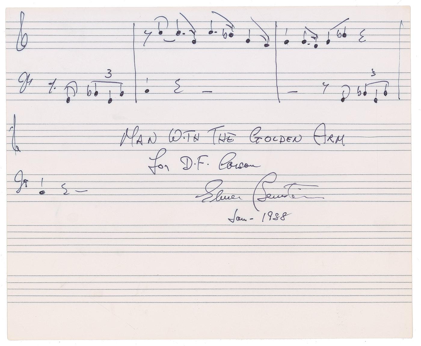 Fourteen-time Academy Award nominee, winning the Award in 1967 for his score for Thoroughly Modern Millie. Other nominated scores include The Man with the Golden Arm, The Magnificent Seven, Summer and Smoke, To Kill a Mockingbird, The Return of the Seven, Hawaii, and True Grit. AMQS on an off-white 8.5 x 7 musically-lined sheet. Bernstein pens four bars of music (both bass and tenor clefs) for the theme to ‘The Man with the Golden Arm,’ signed and inscribed “Man With The Golden Arm for D. F. Carson, Elmer Bernstein Jan. 1988.” In fine condition.