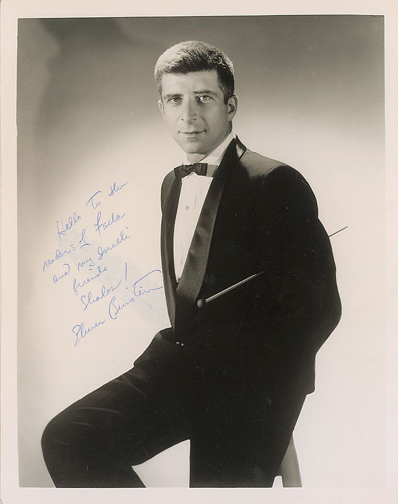 Vintage 8 x 10 photo of Bernstein posing with his conductor’s baton, signed and inscribed in blue ballpoint, “Hello to the readers of Facla and my Israeli friends, Shalom! Elmer Bernstein.” Light scattered surface marks and creases, and slight show-through from ink notations to reverse, otherwise fine condition.