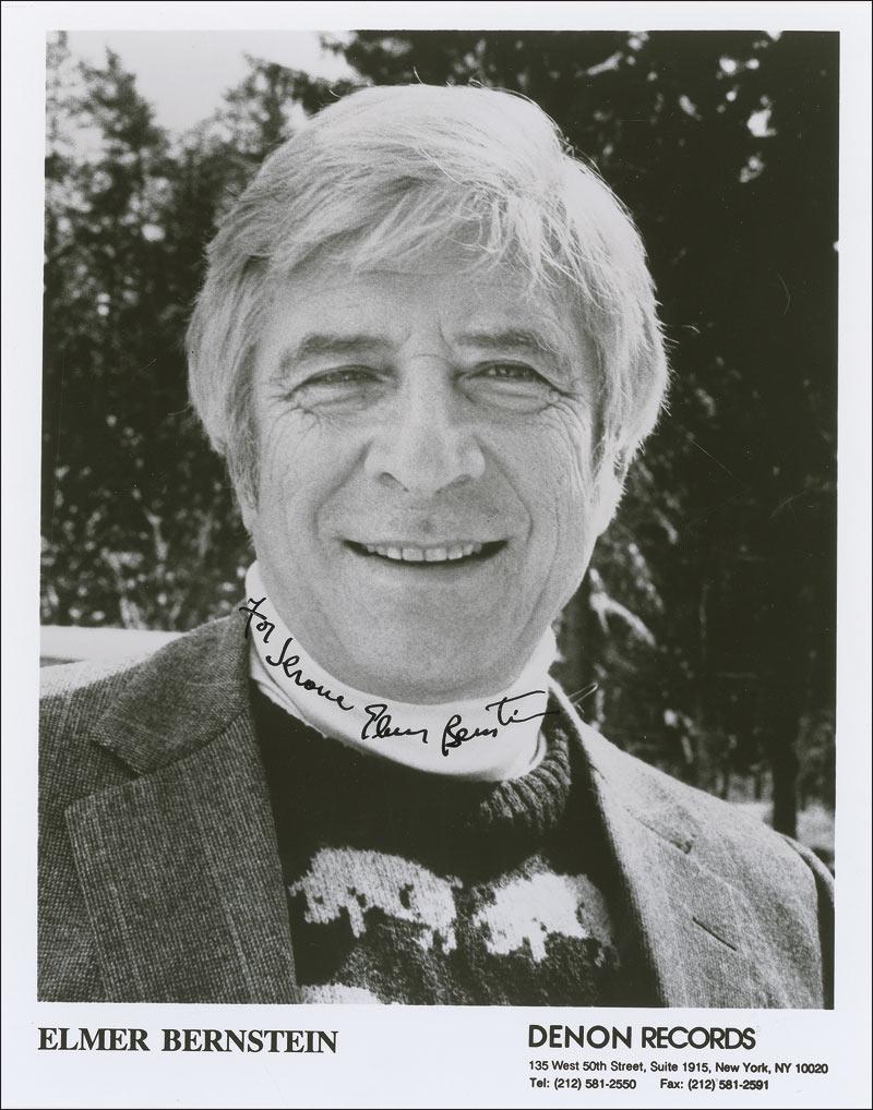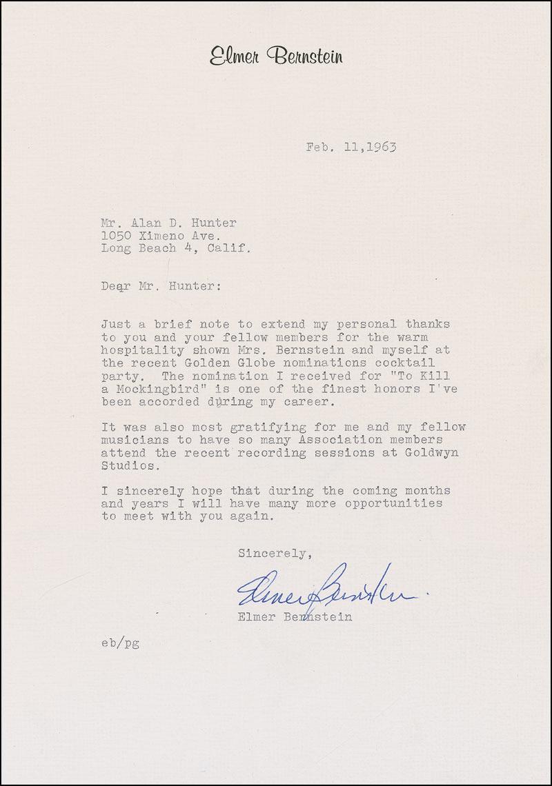 Fourteen-time Academy Award nominee, winning the Award in 1967 for his score for Thoroughly Modern Millie. Other nominated scores include The Man with the Golden Arm, The Magnificent Seven, Summer and Smoke, To Kill a Mockingbird, The Return of the Seven, Hawaii, and True Grit. Glossy 8 x 10 publicity photo, signed and inscribed in black felt tip; and a one-page TLS, 7.25 x 10.5, dated February 11, 1963. In part: “Just a brief note to extend my personal thanks to you and your fellow members for the warm hospitality shown Mrs. Bernstein and myself at the recent Golden Globe nominations cocktail party. The nomination I received for ‘To Kill a Mockingbird’ is one of the finest honors I’ve been accorded during my career.” In fine condition.