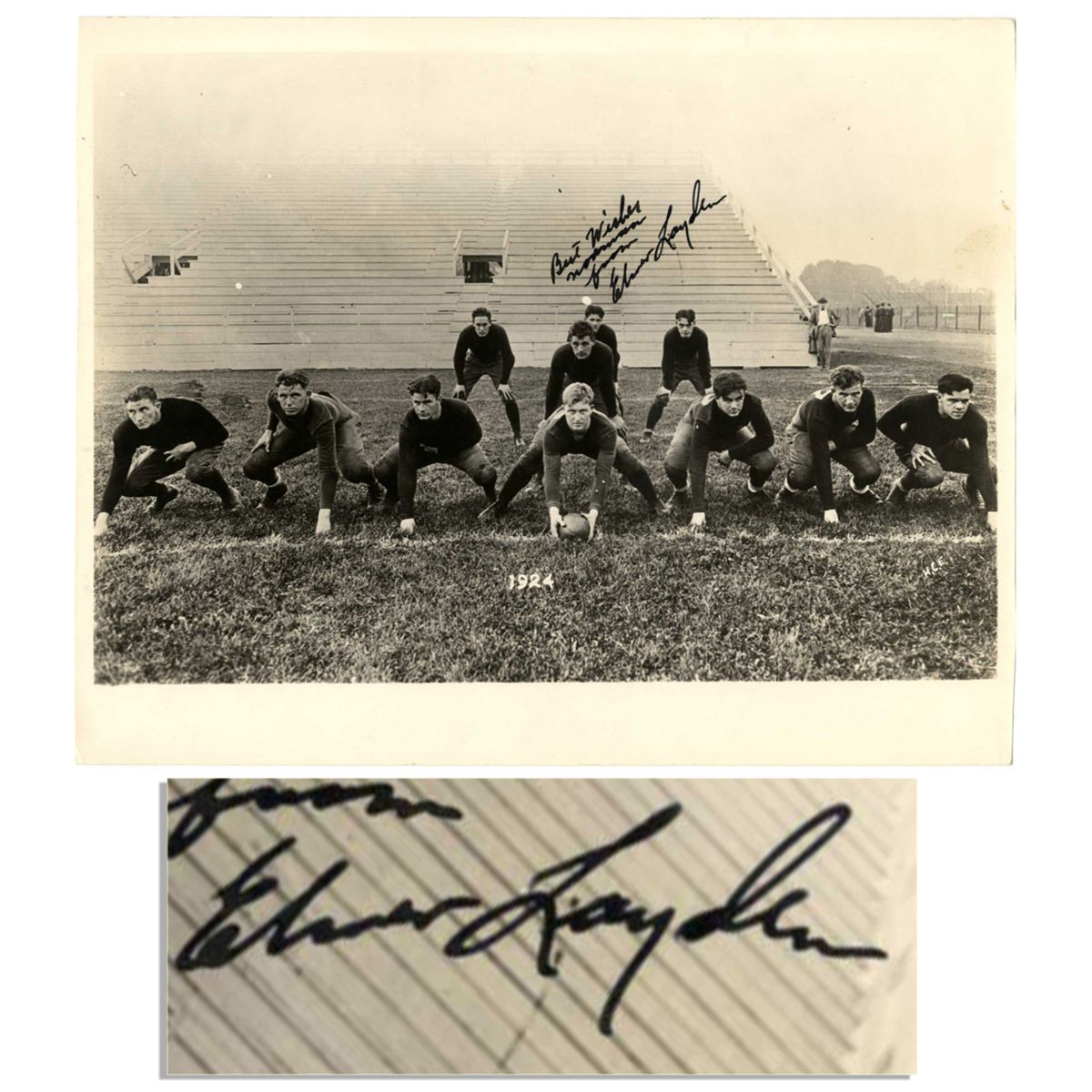 Elmer Layden signed 10'' x 8'' glossy photo. Layden, one of the ''Four Horsemen'' of the University of Notre Dame's 1924 football team coached by the legendary Knute Rockne, signs, ''Best Wishes Norman from Elmer Layden''. The photo is dated 1924 and the players are identified on the verso. Minor soiling and toning, else very good. With JSA COA.