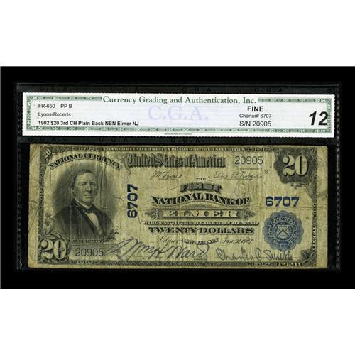 <B>Elmer, NJ</B></I> - $20 1902 Plain Back Fr. 650 <B>The First NB</B></I> Ch. # 6707<BR>Only the second $20 Plain back from here. Strong stamped signatures remain on this complete note with a few pinholes.