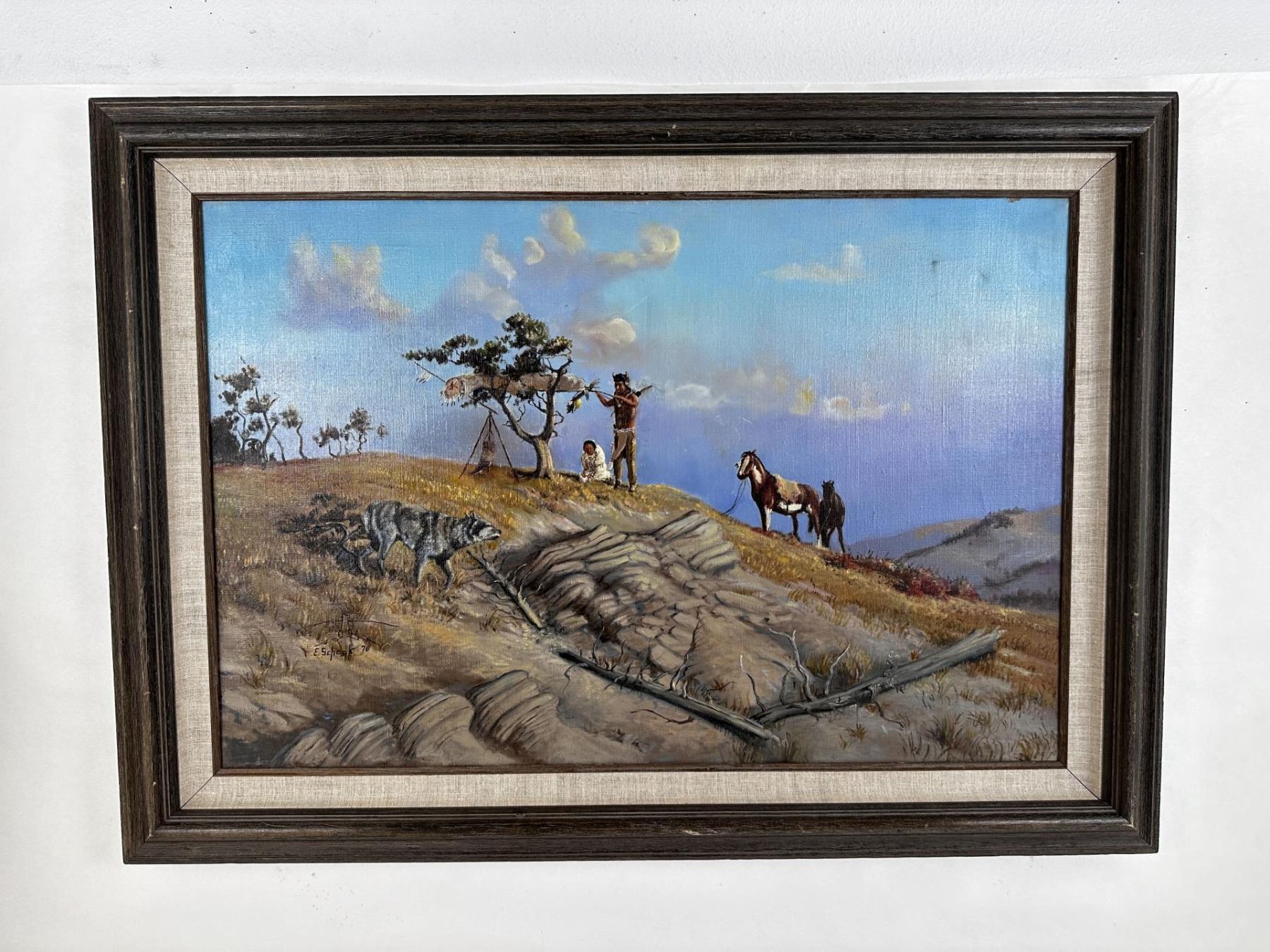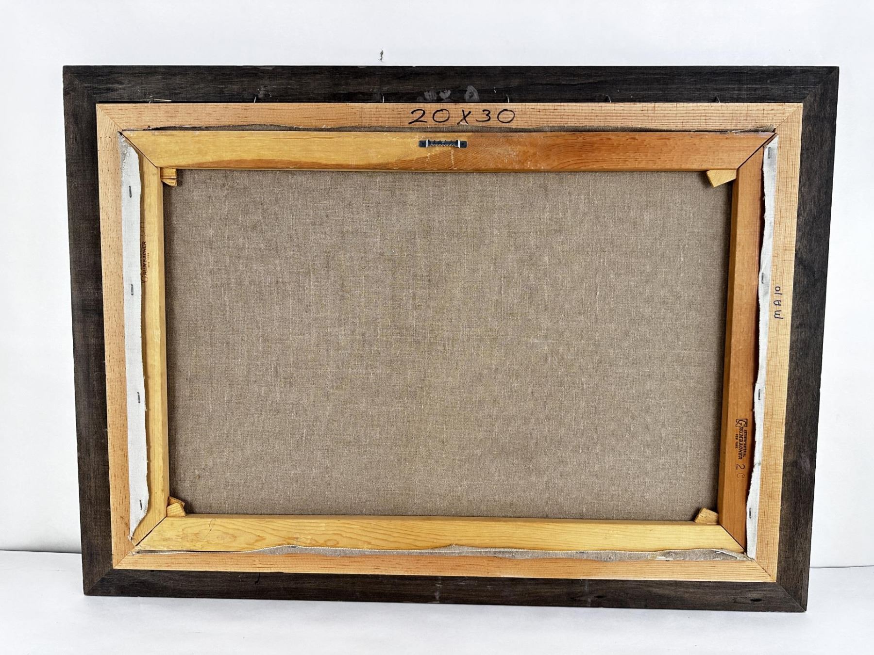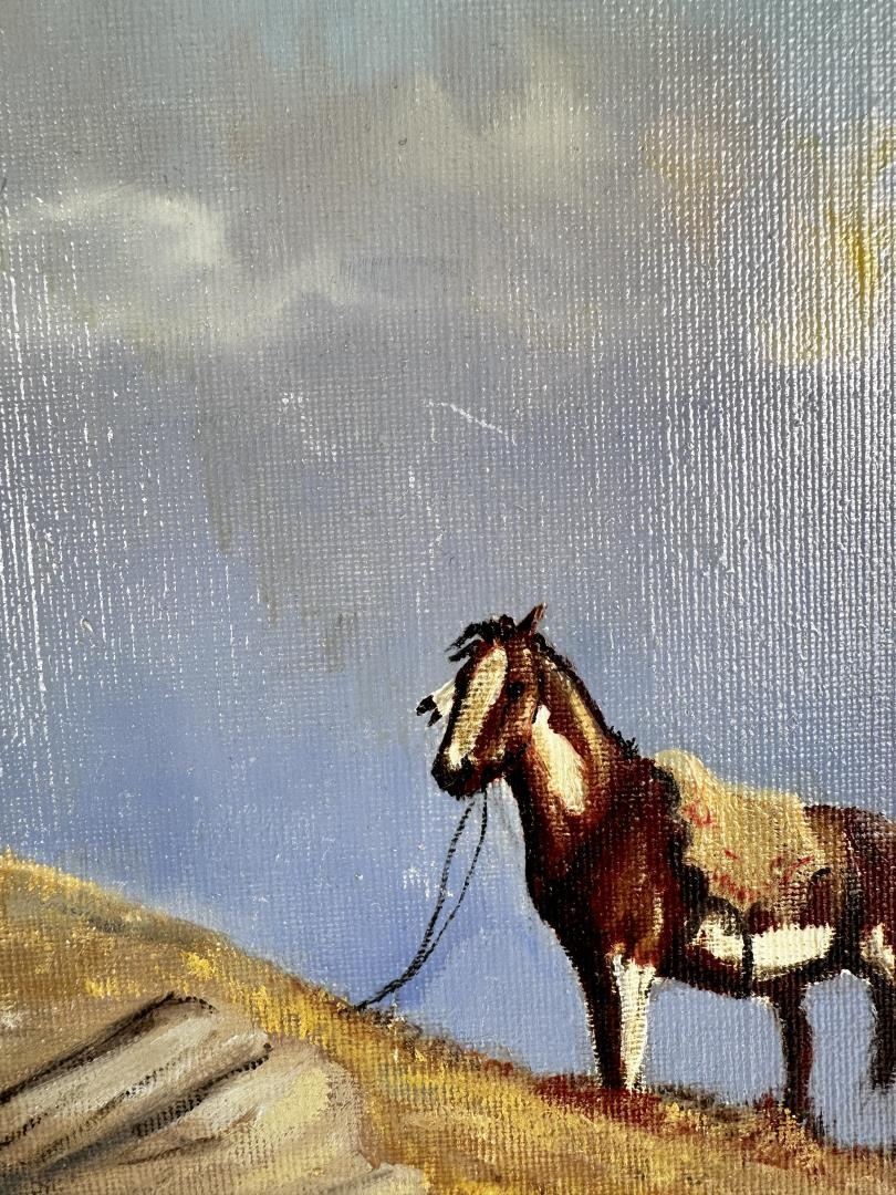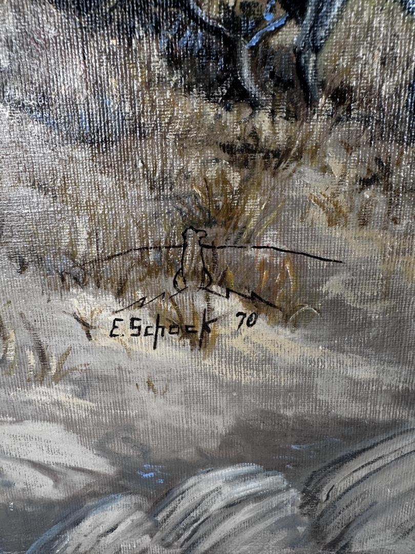20" by 30" unframed, 26" by 36" framed. Paint flaked in the top right, small vertical scratch in the varnish above horse, two small impressions in the canvas as shown. Elmer Schock is active/lives in United States. Elmer Schock is known for Painting.