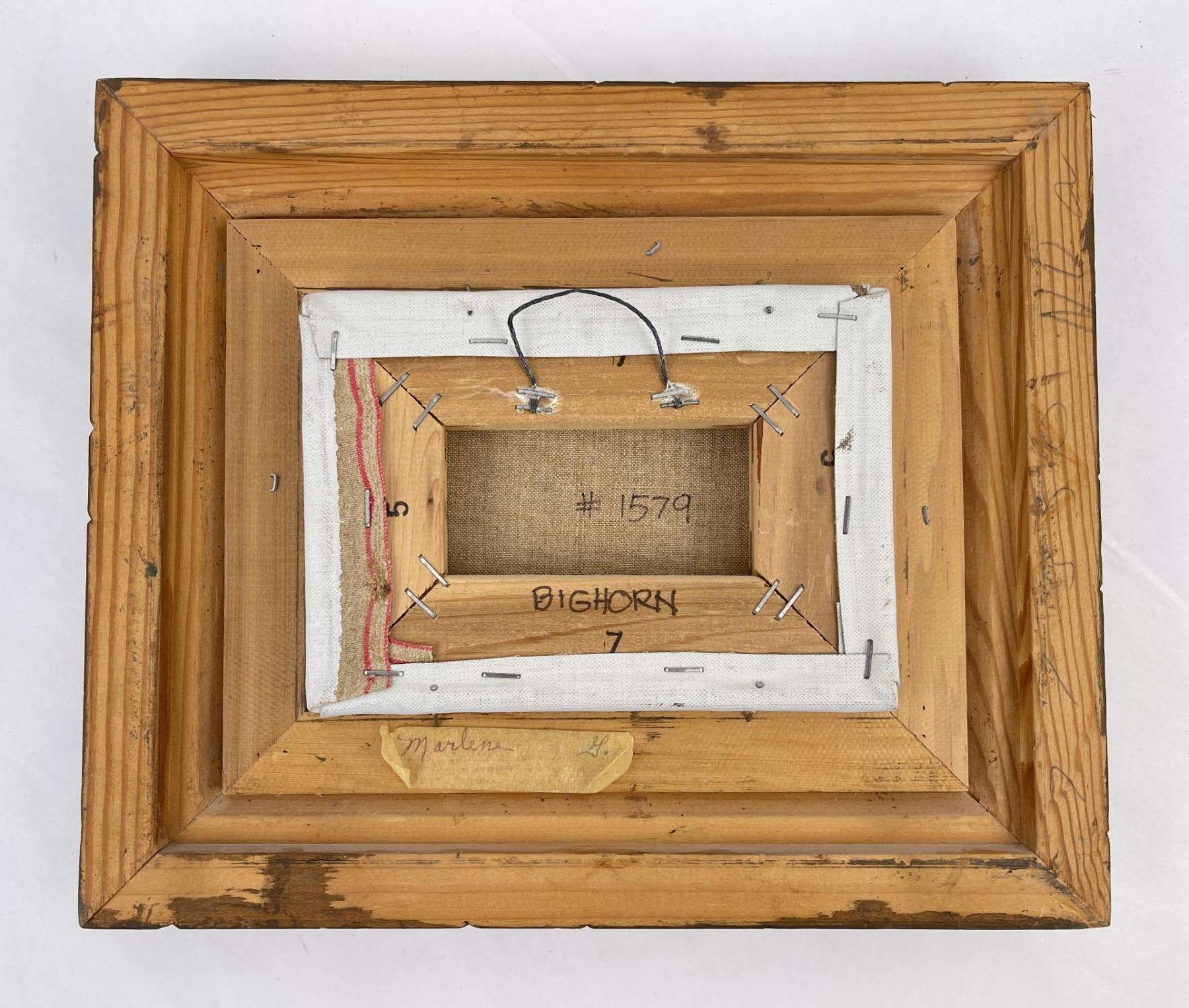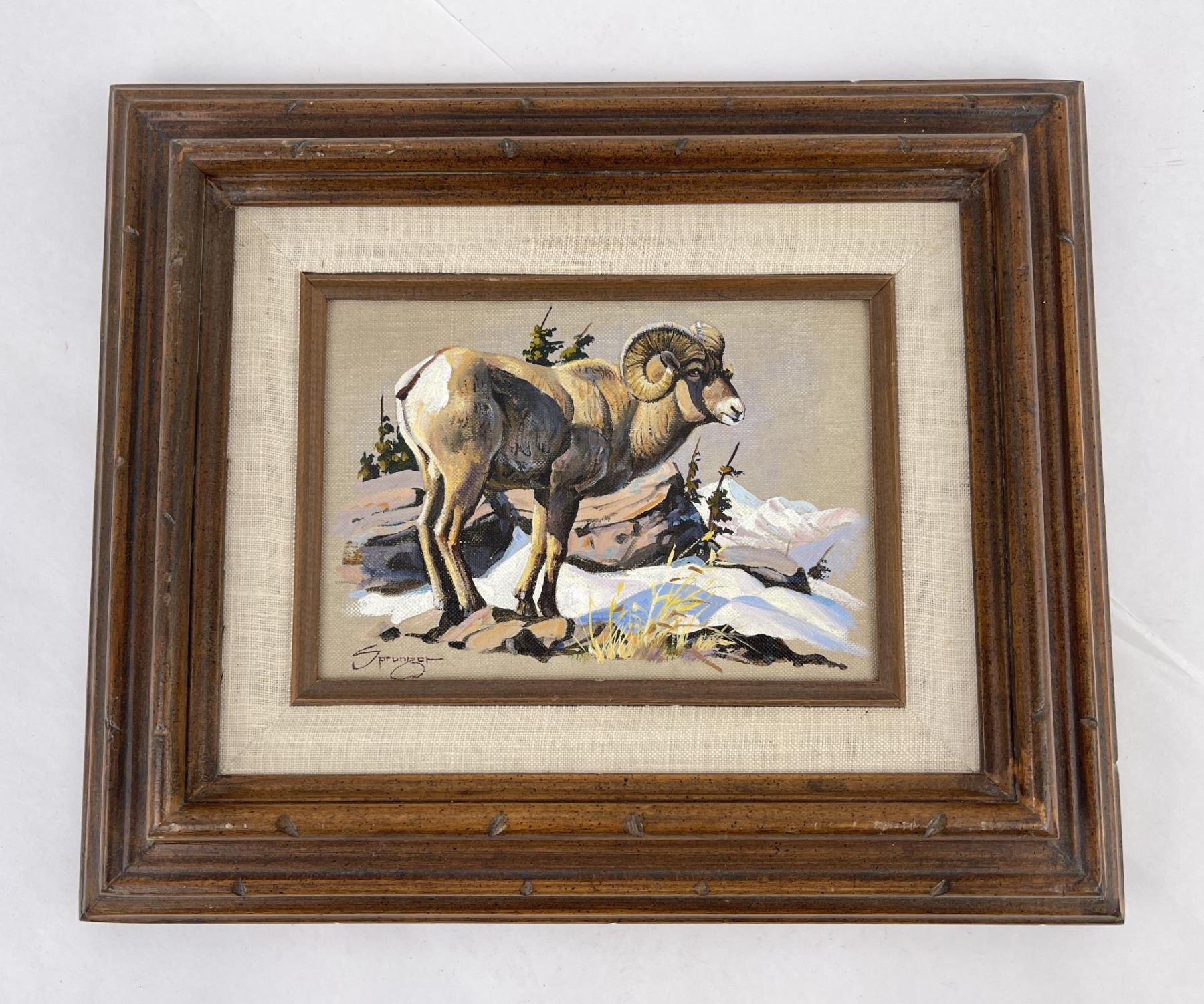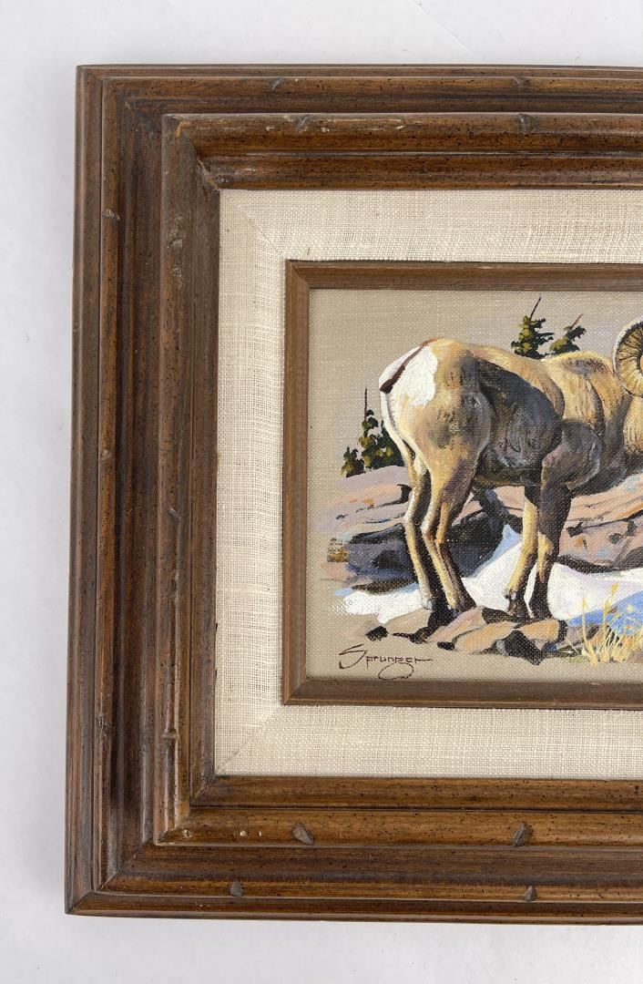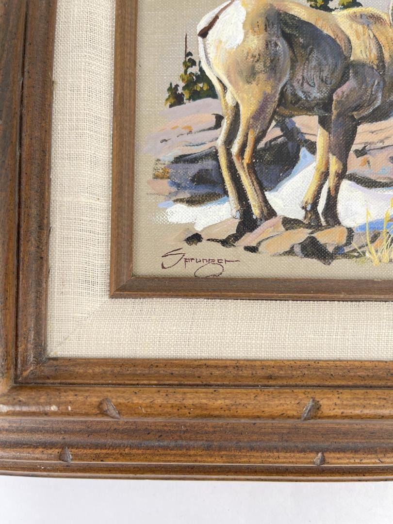 Oil on Canvas. 10 1/4" by 12 1/4" framed. Elmer Sprunger grew up on the west side of the Rockies around Bigfork, Flathead and Swan Lake. His sophomore year of high school was in Butte, where his art teacher was Elizabeth Lochrie. Her lessons took hold. Sprunger married Marie in 1940, and they moved to Seattle where his art training helped him to draw the patterns for Liberty Ships onto huge steel plates and to learn drafting. He worked in the woods cutting vitally needed timber and then joined the Army. After a year in California and another in Hawaii, he returned to the Olympic Peninsula where he worked in logging, construction, and road-building. In 1950 he came back to his boyhood haunts near Swan Lake. Besides carpentry, he did sign painting and made posters. His goal was never art so much as hunting and fishing. The three went together in his thinking. He and Marie have built their own comfortable house. Two of his major principles are fitting the animals to the land, so that none show up in a painting where they would never be in life, and making each animal a unique individual. He does use a camera, but only to record details for reference later.