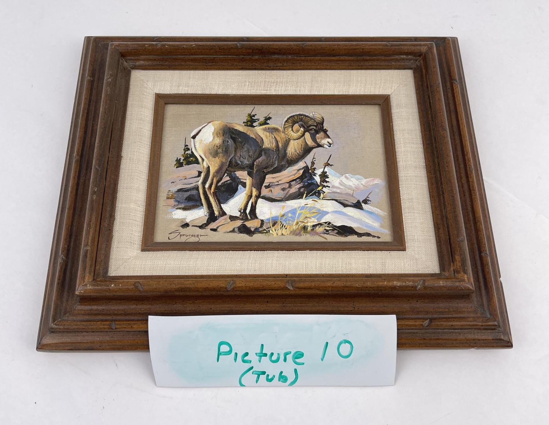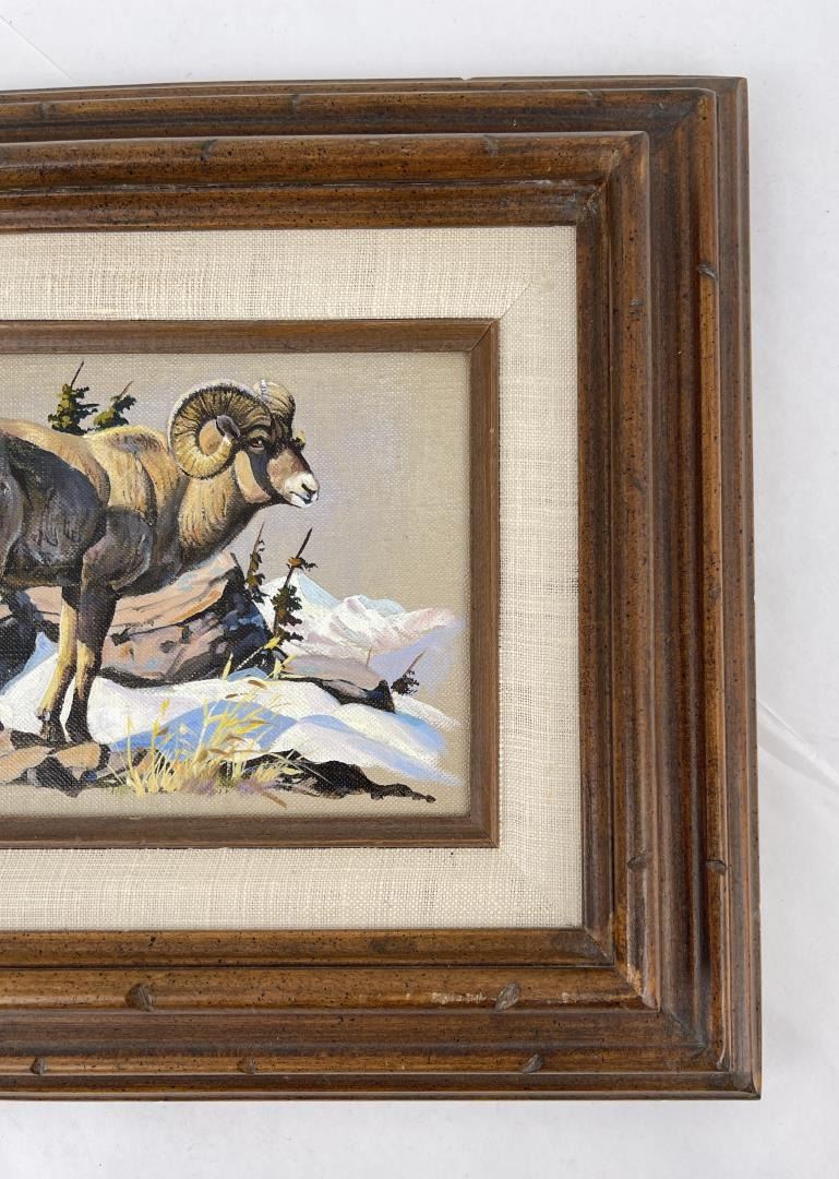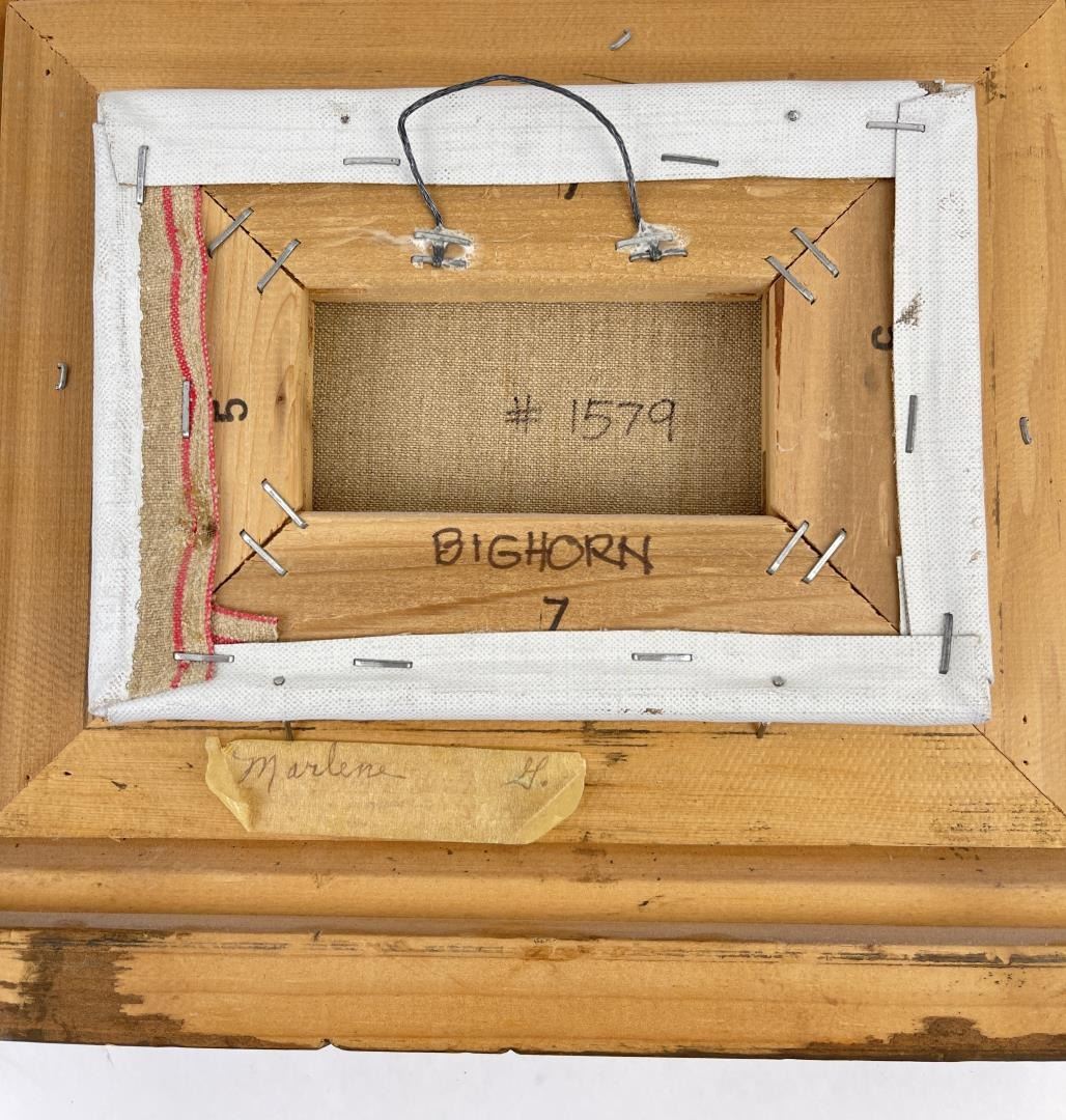 Oil on Canvas. 10 1/4" by 12 1/4" framed. Elmer Sprunger grew up on the west side of the Rockies around Bigfork, Flathead and Swan Lake. His sophomore year of high school was in Butte, where his art teacher was Elizabeth Lochrie. Her lessons took hold. Sprunger married Marie in 1940, and they moved to Seattle where his art training helped him to draw the patterns for Liberty Ships onto huge steel plates and to learn drafting. He worked in the woods cutting vitally needed timber and then joined the Army. After a year in California and another in Hawaii, he returned to the Olympic Peninsula where he worked in logging, construction, and road-building. In 1950 he came back to his boyhood haunts near Swan Lake. Besides carpentry, he did sign painting and made posters. His goal was never art so much as hunting and fishing. The three went together in his thinking. He and Marie have built their own comfortable house. Two of his major principles are fitting the animals to the land, so that none show up in a painting where they would never be in life, and making each animal a unique individual. He does use a camera, but only to record details for reference later.