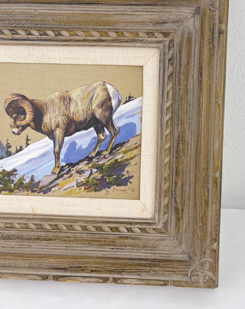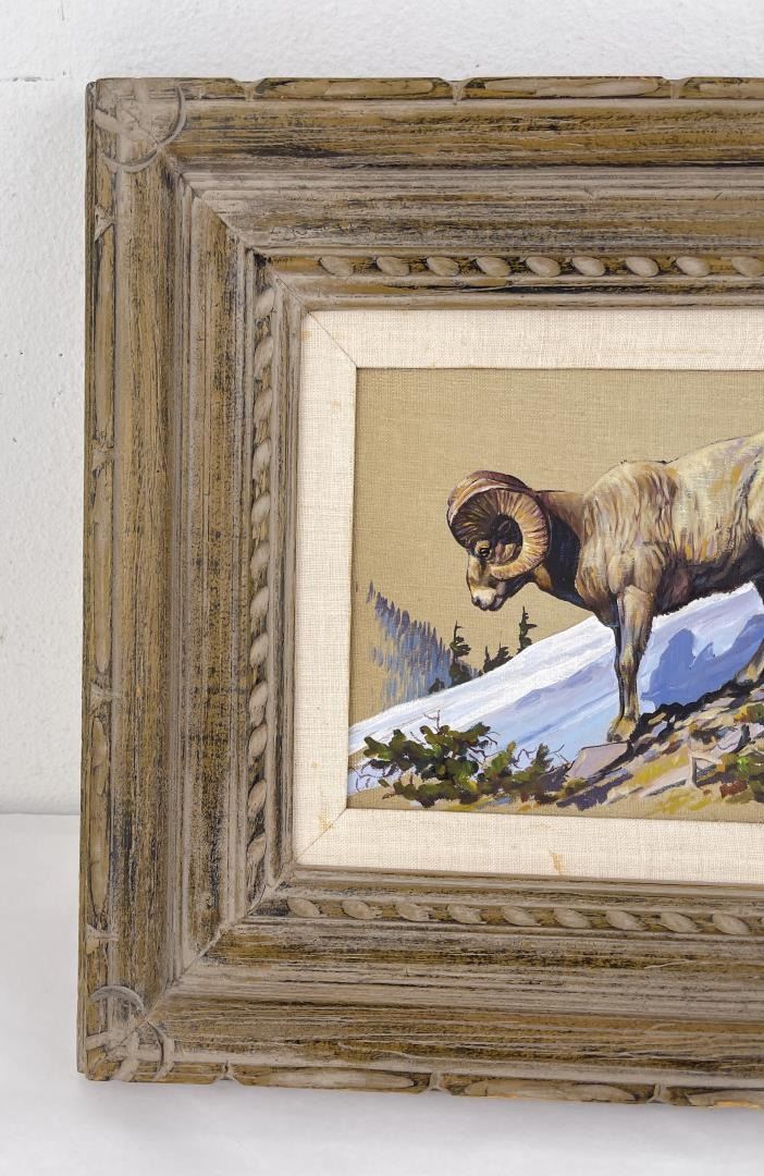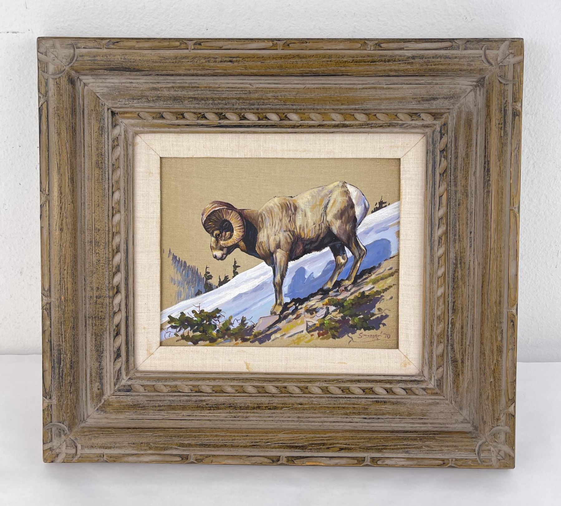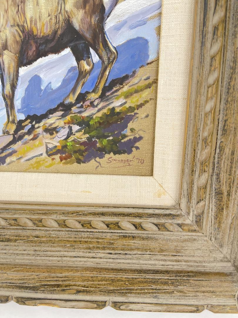 Oil on Canvas. 16 1/2" by 18 1/2" framed. Elmer Sprunger grew up on the west side of the Rockies around Bigfork, Flathead and Swan Lake. His sophomore year of high school was in Butte, where his art teacher was Elizabeth Lochrie. Her lessons took hold. Sprunger married Marie in 1940, and they moved to Seattle where his art training helped him to draw the patterns for Liberty Ships onto huge steel plates and to learn drafting. He worked in the woods cutting vitally needed timber and then joined the Army. After a year in California and another in Hawaii, he returned to the Olympic Peninsula where he worked in logging, construction, and road-building. In 1950 he came back to his boyhood haunts near Swan Lake. Besides carpentry, he did sign painting and made posters. His goal was never art so much as hunting and fishing. The three went together in his thinking. He and Marie have built their own comfortable house. Two of his major principles are fitting the animals to the land, so that none show up in a painting where they would never be in life, and making each animal a unique individual. He does use a camera, but only to record details for reference later.