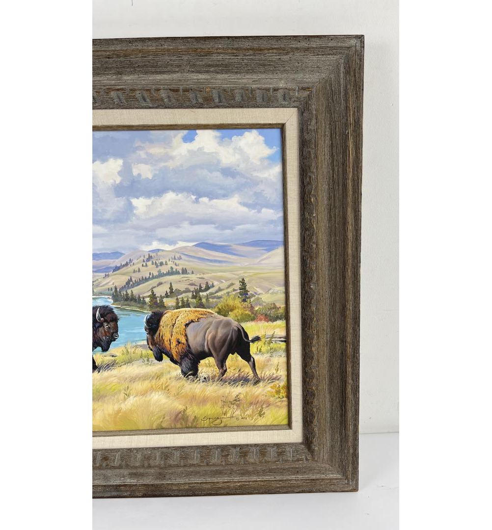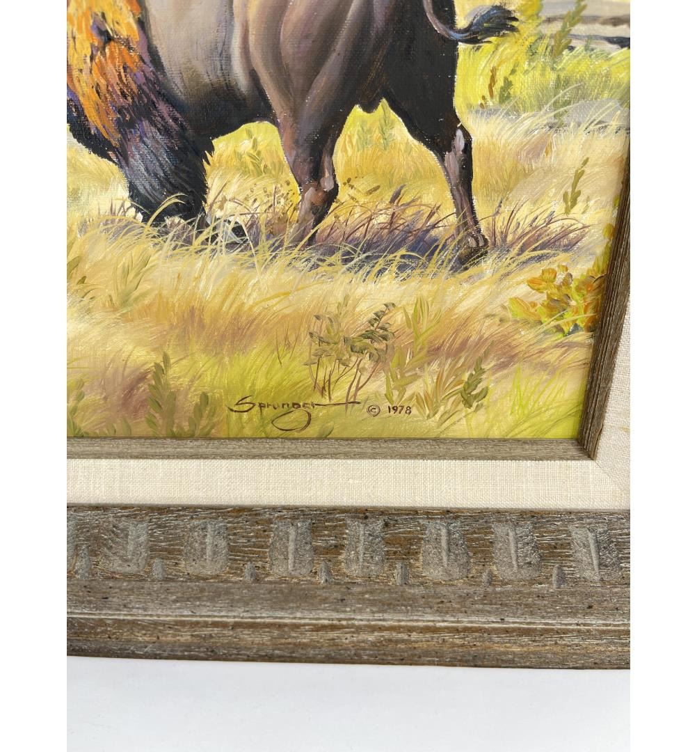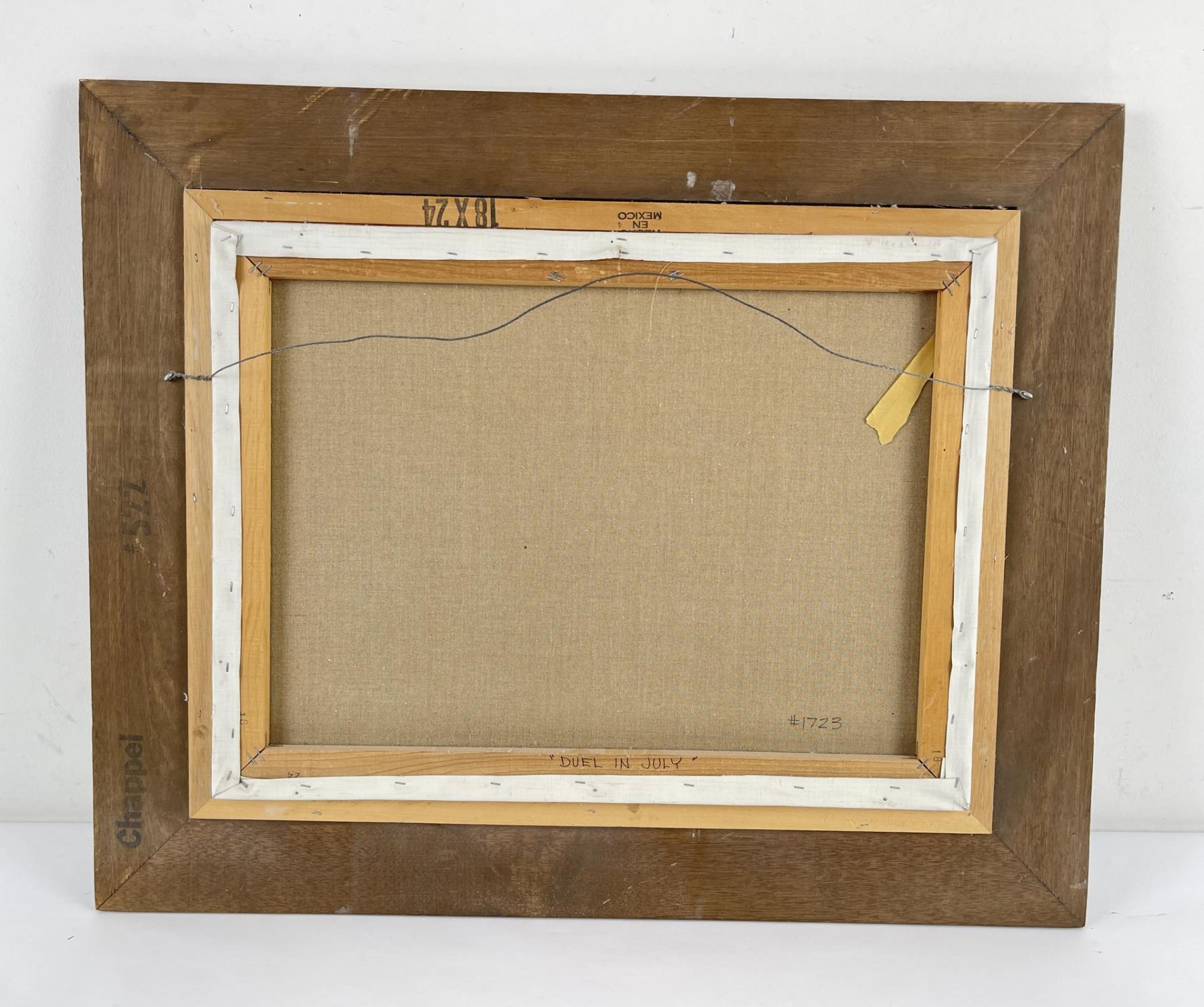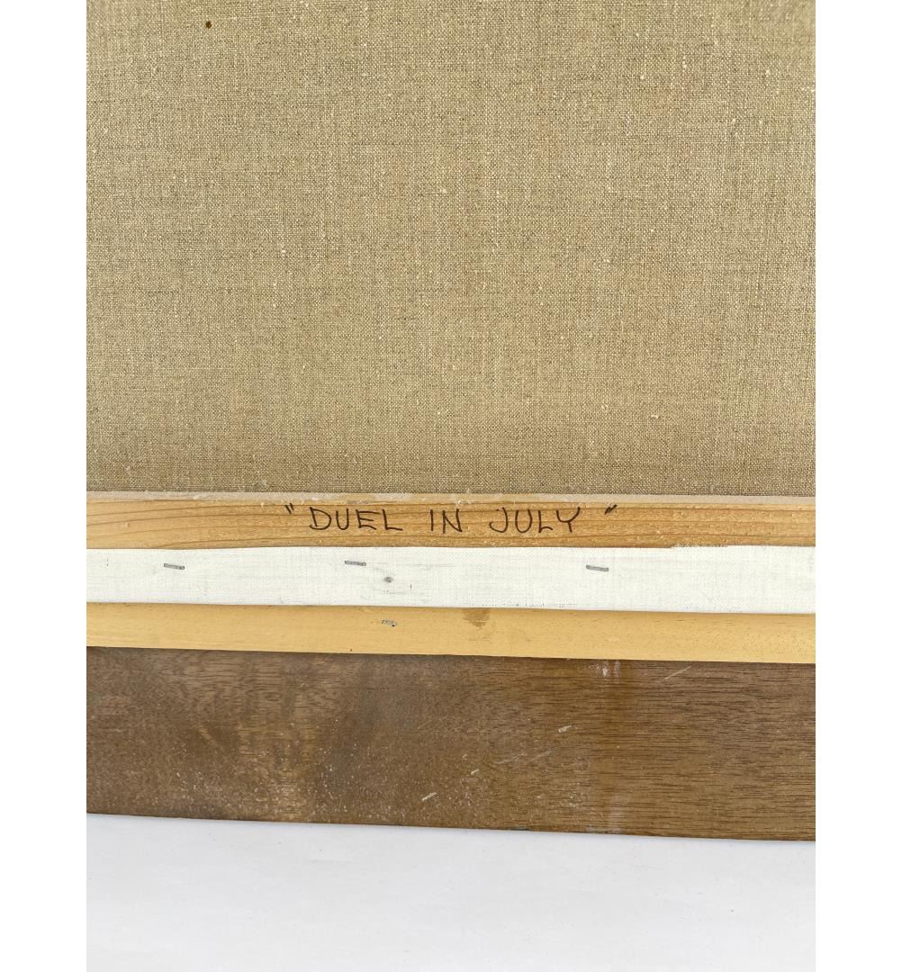 26 1/2" by 32 1/2" framed. Title is "Duel in July". Elmer Sprunger grew up on the west side of the Rockies around Bigfork, Flathead and Swan Lake. His sophomore year of high school was in Butte, where his art teacher was Elizabeth Lochrie. Her lessons took hold. Sprunger married Marie in 1940, and they moved to Seattle where his art training helped him to draw the patterns for Liberty Ships onto huge steel plates and to learn drafting. He worked in the woods cutting vitally needed timber and then joined the Army. After a year in California and another in Hawaii, he returned to the Olympic Peninsula where he worked in logging, construction, and road-building. In 1950 he came back to his boyhood haunts near Swan Lake. Besides carpentry, he did sign painting and made posters. His goal was never art so much as hunting and fishing. The three went together in his thinking. He and Marie have built their own comfortable house. Two of his major principles are fitting the animals to the land, so that none show up in a painting where they would never be in life, and making each animal a unique individual. He does use a camera, but only to record details for reference later.