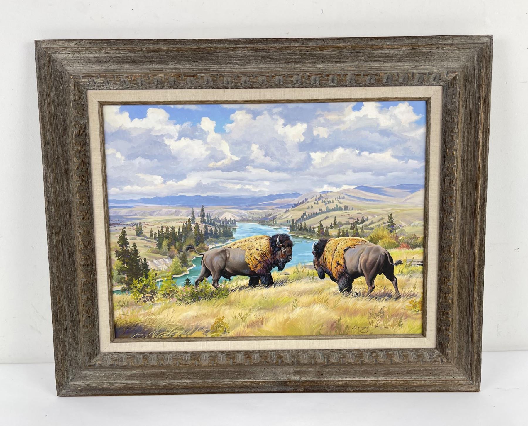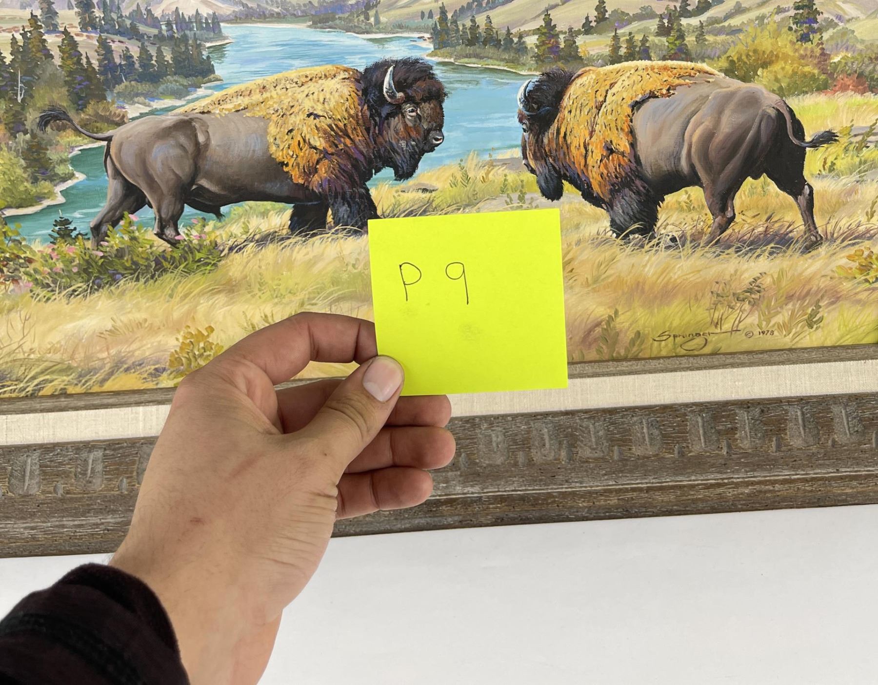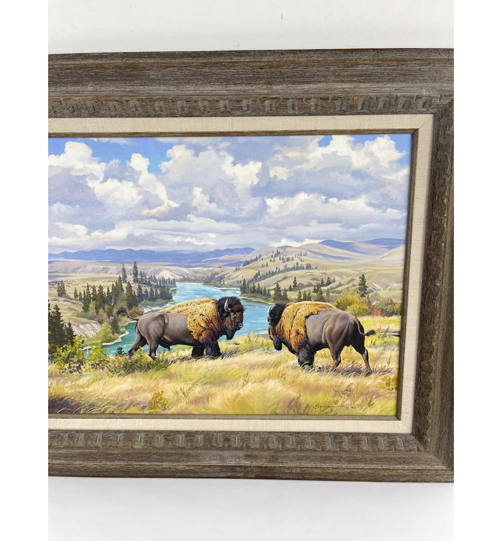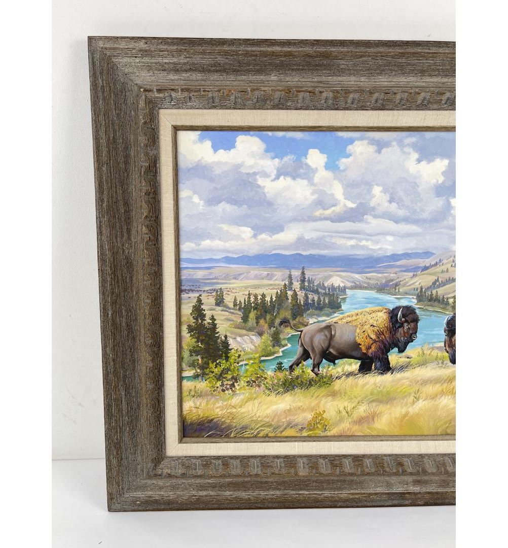 26 1/2" by 32 1/2" framed. Title is "Duel in July". Elmer Sprunger grew up on the west side of the Rockies around Bigfork, Flathead and Swan Lake. His sophomore year of high school was in Butte, where his art teacher was Elizabeth Lochrie. Her lessons took hold. Sprunger married Marie in 1940, and they moved to Seattle where his art training helped him to draw the patterns for Liberty Ships onto huge steel plates and to learn drafting. He worked in the woods cutting vitally needed timber and then joined the Army. After a year in California and another in Hawaii, he returned to the Olympic Peninsula where he worked in logging, construction, and road-building. In 1950 he came back to his boyhood haunts near Swan Lake. Besides carpentry, he did sign painting and made posters. His goal was never art so much as hunting and fishing. The three went together in his thinking. He and Marie have built their own comfortable house. Two of his major principles are fitting the animals to the land, so that none show up in a painting where they would never be in life, and making each animal a unique individual. He does use a camera, but only to record details for reference later.