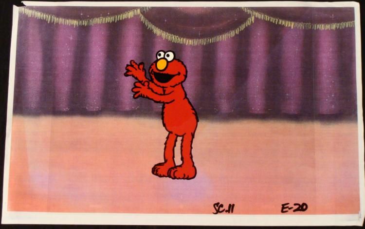 In Elmo's world everyone is happy and full of laughter. Elmo enjoys making friends and having a good time. In the cel, Elmo is on a stage in front of his fans * * * Original Animation Cel & Printed Background * * Medium: Hand painted acetate celDetails: Animation notations and peg holes * * Size of cel: 10 1/2 x 12 1/2 inchesSize of background: 11 x 17 inches * * Condition: Very good; slight creases on corner * * * This is an original hand-painted cel set-up used in the production of an episode of "Sesame Street." Each one-of-a-kind set-up represents a slight change in position of the characters. When individually photographed and projected in rapid succession, the * images appear to move. * * To create production cels, the original animator's drawing is transferred onto an acetate cel (by hand-inking and/or photo copying). The cel is then hand-painted on the reverse side. The background accompanying this set-up is a printed reproduction background. * *
