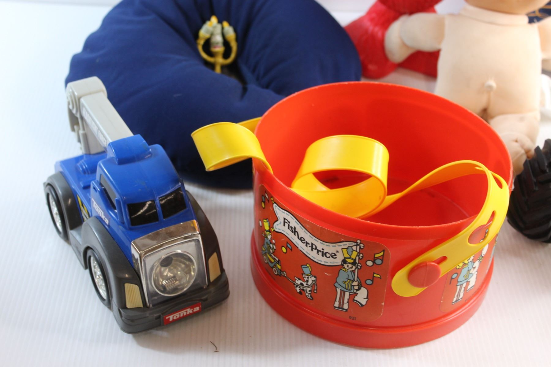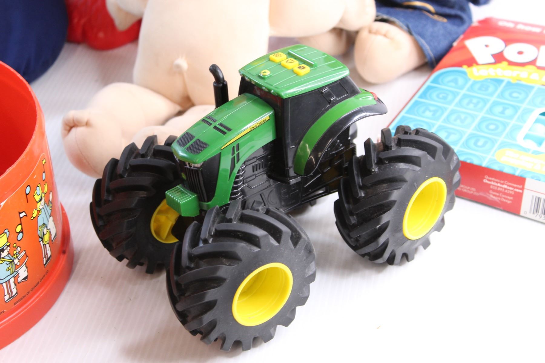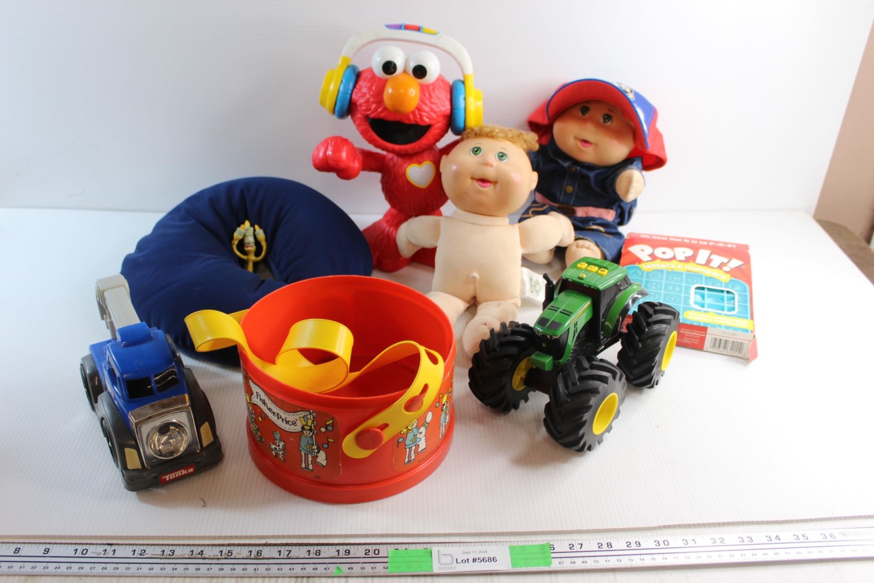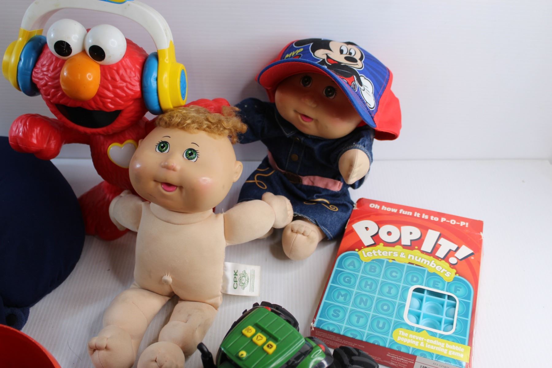 Elmo Toy, Neck Pillow, John Deere Tractor Toy, Cabbage Patch Doll, Pop It and Assorted Toys