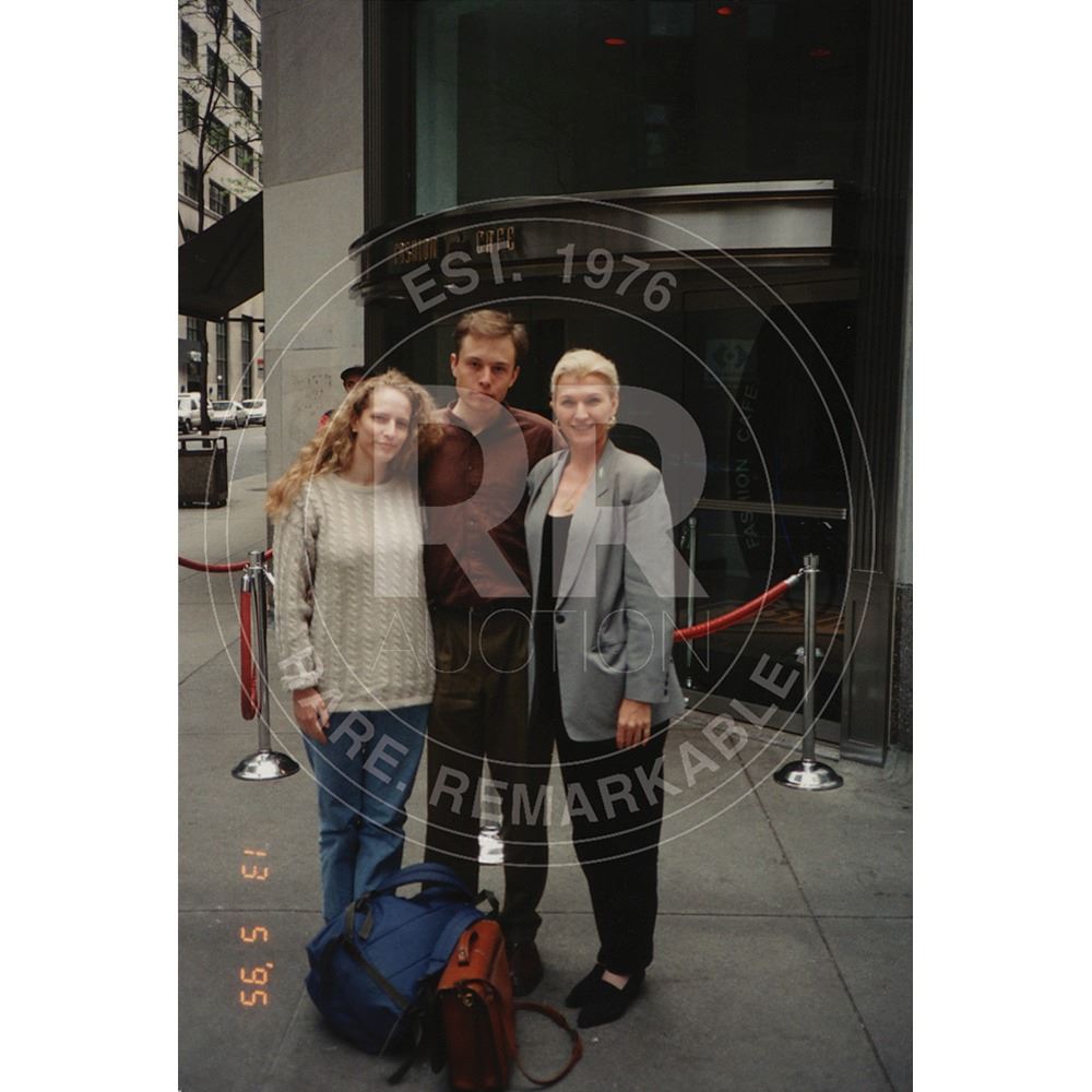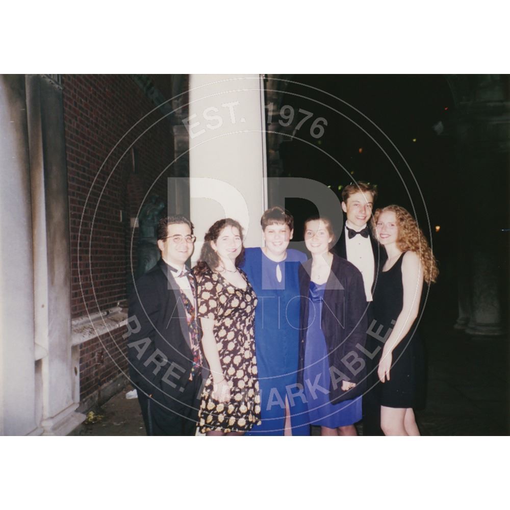 Beautiful 14k gold necklace with a small green emerald that Elon Musk presented as a birthday gift to his college girlfriend Jennifer Gwynne in late 1994. Included with the necklace are two original candid photos of Musk and Gwynne—one depicting them standing with Musk’s mother, Maye, during a visit to New York City (date-stamped to May 13, 1995), and the other of Musk and Gwynne posing with four other Resident Advisors before an end-of-the-year formal at the University of Pennsylvania in 1995. In overall very fine condition.