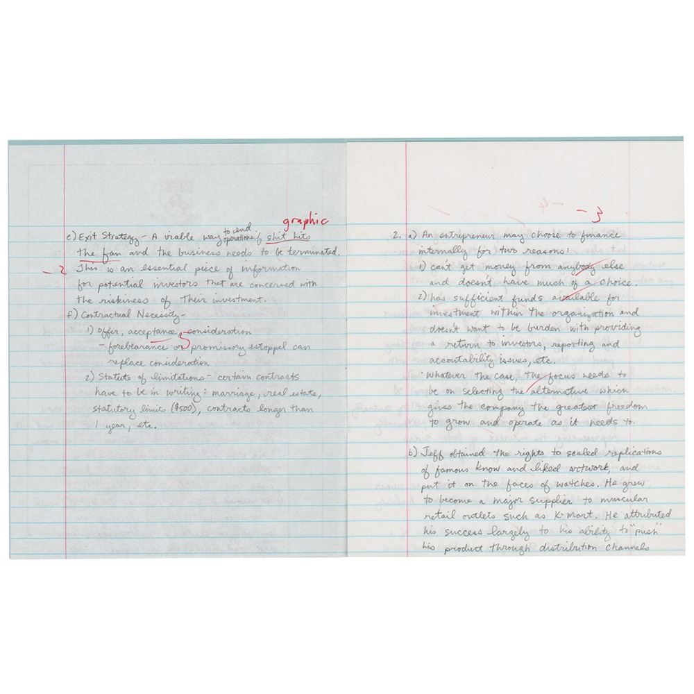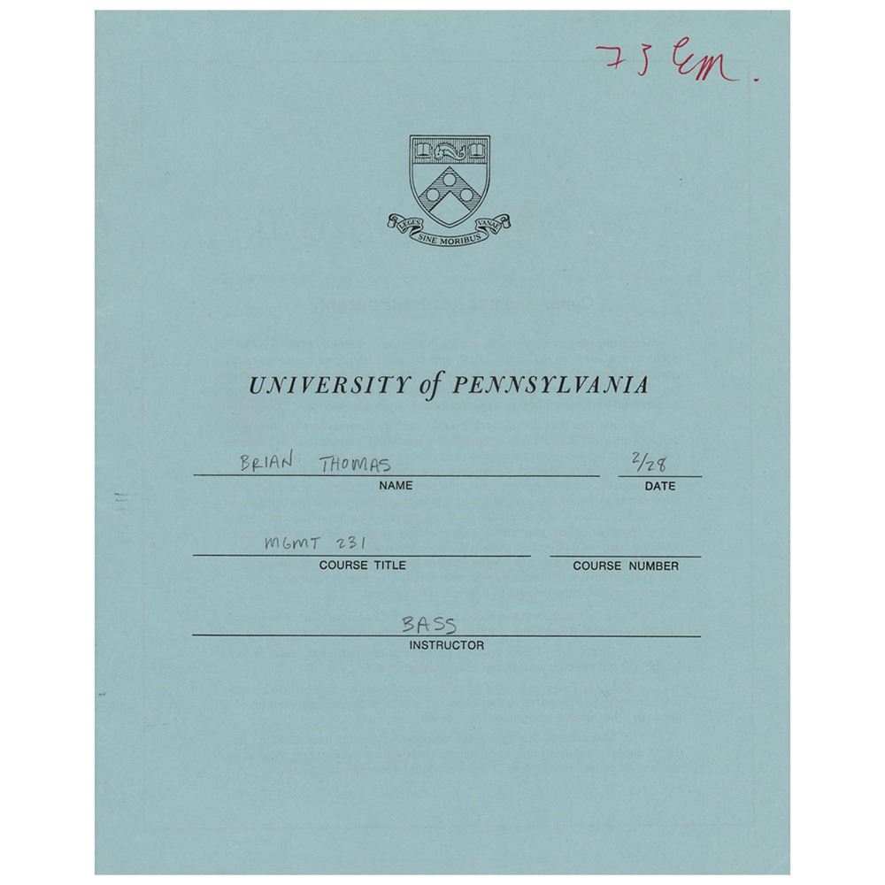Two pieces of coursework annotated and initialed by Elon Musk as a teaching assistant in an entrepreneurship class (MGMT 231) taught by Myles Bass at the University of Pennsylvania's Wharton School in 1995. The first, classic UPenn written exam booklet with nine pages filled out, is graded and initialed by Musk on the front cover in red ink, "73, EM." Throughout, he checks off key points made in the exam, striking off points for incorrect or inaccurate answers. In one instance, where the student defines "Exit Strategy" as "a viable way to end operations if shit hits the fan," Musk writes, "graphic," and deducts two points.