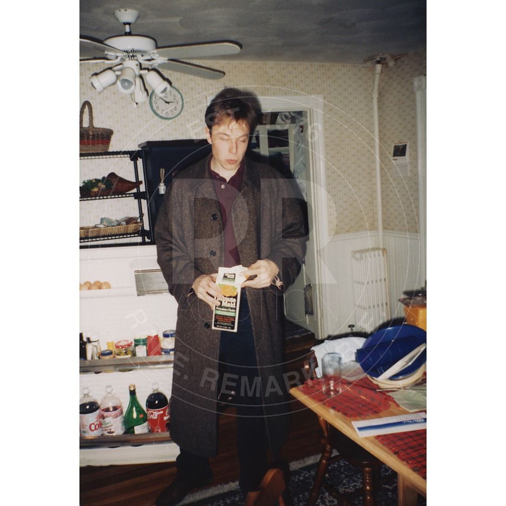 Original glossy 4 x 5.75 candid photo of Elon Musk in 1995, standing in a kitchen next to an open refrigerator door and opening a carton of orange juice. In very fine condition.