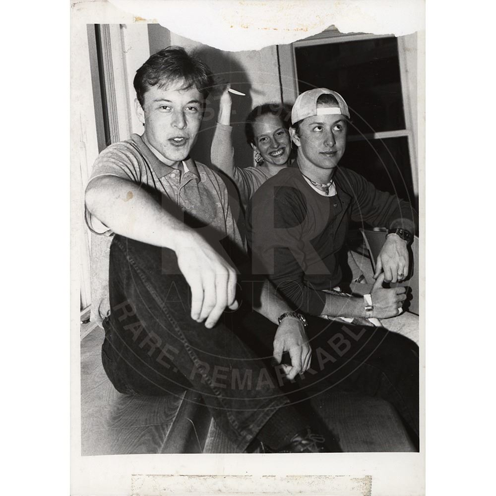 Original glossy 5 x 7 candid photo of Elon Musk as a 23-year-old senior at the University of Pennsylvania, showing him seated with his girlfriend, Jennifer Gwynne, and another friend at an RA staff meeting. In very good condition, with two vertical scratches, old tape in the bottom border, and tape-related emulsion loss to the top.
