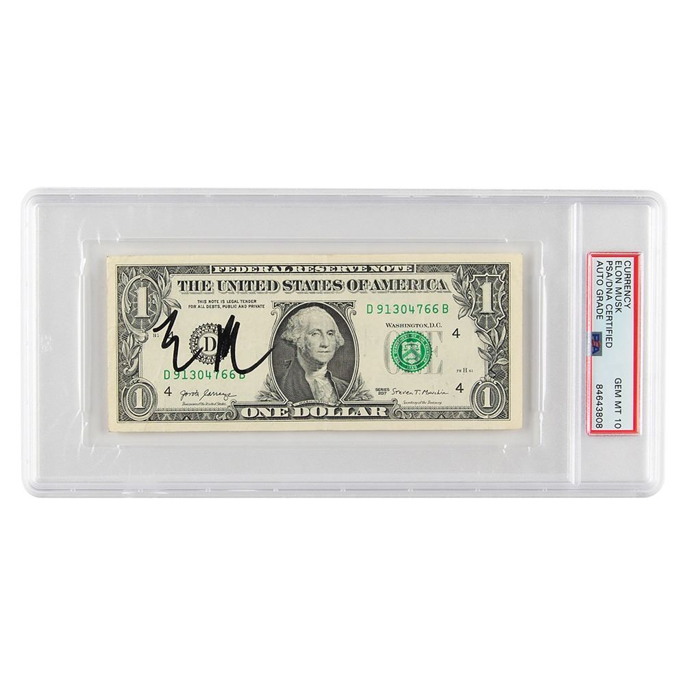 Ultra-desirable Series 2017 one dollar bill, signed on the left side in black felt tip by Elon Musk. In very fine condition. Musk placed first on Forbes' 'The Richest of 2022' list with a net worth of over $230 billion dollars—if converted into one dollar bills, Musk's wealth would tower into outer space at over 156 miles high. A hugely desirable format boasting a perfect autograph of the CEO of Tesla and SpaceX. Encapsulated and graded by PSA/DNA as "GEM MINT 10."
