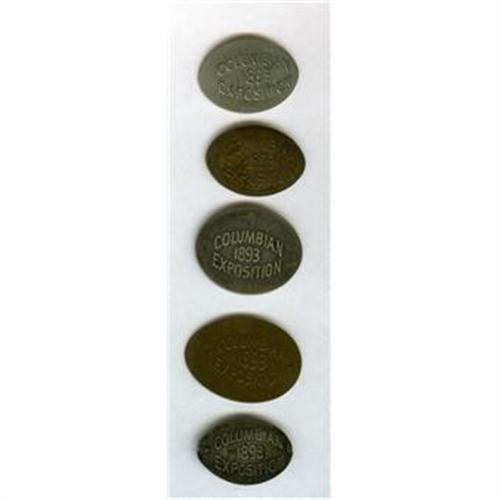 <B>Elongated Group Lot.</B></I> Includes five different denominations of U.S. coins elongated at the Columbian World's Fair in 1892 or 1893. The coins are an 1884 (date showing) Indian cent, a rare undated two cent coin, an undated Shield nickel, an 1886 (date showing) Seated Liberty dime, and a 1893-O (date and mintmark visible) Barber quarter. A fantastic opportunity for the collector of Columbian Exposition collectibles to secure some of the scarcest-denomination elongated coins. Current market value about $250. Viewing is recommended.