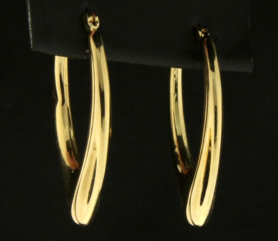 In 14k yellow gold and approx. 1-3/8" x 13/16". Hollow style with lever backs. Very small, shallow dent near back on one side (not noticeable). 3.1g