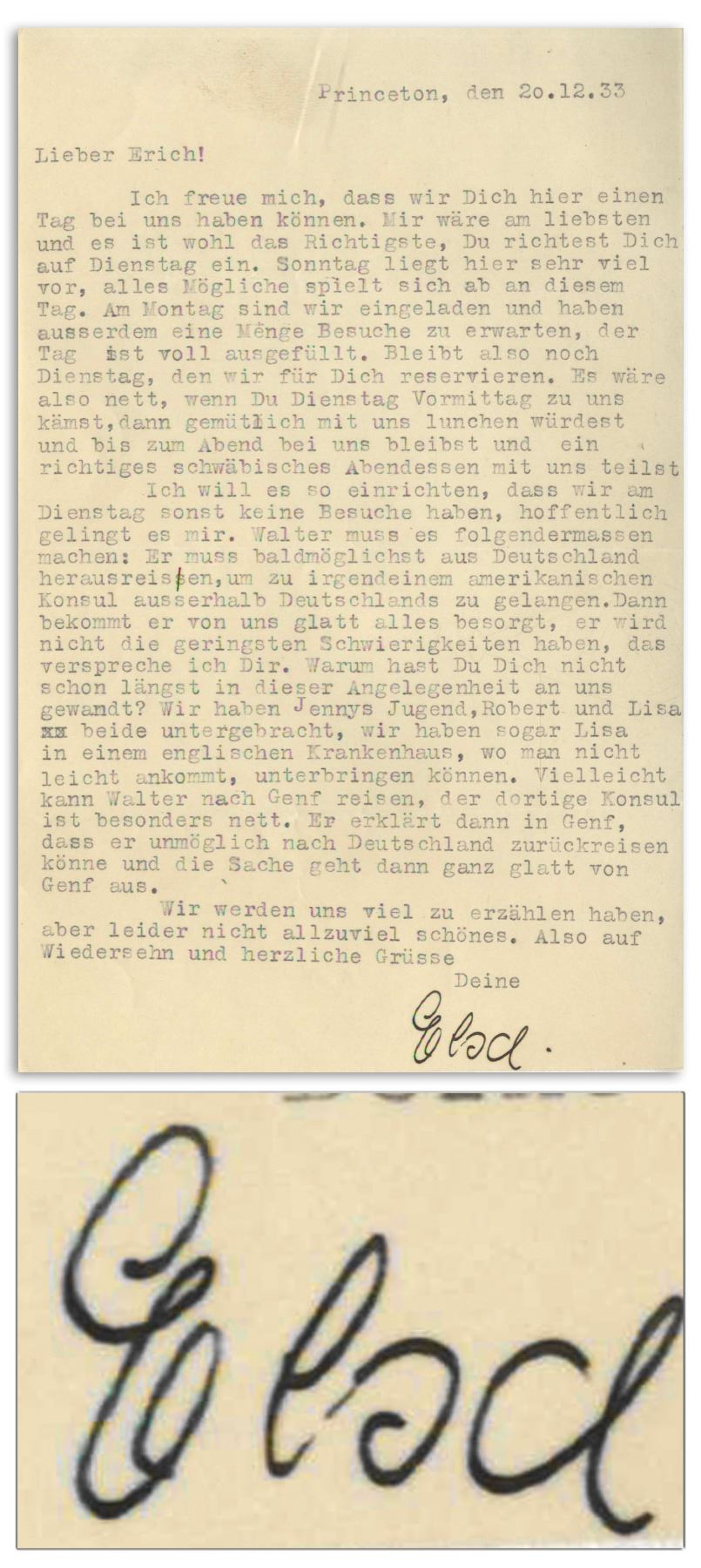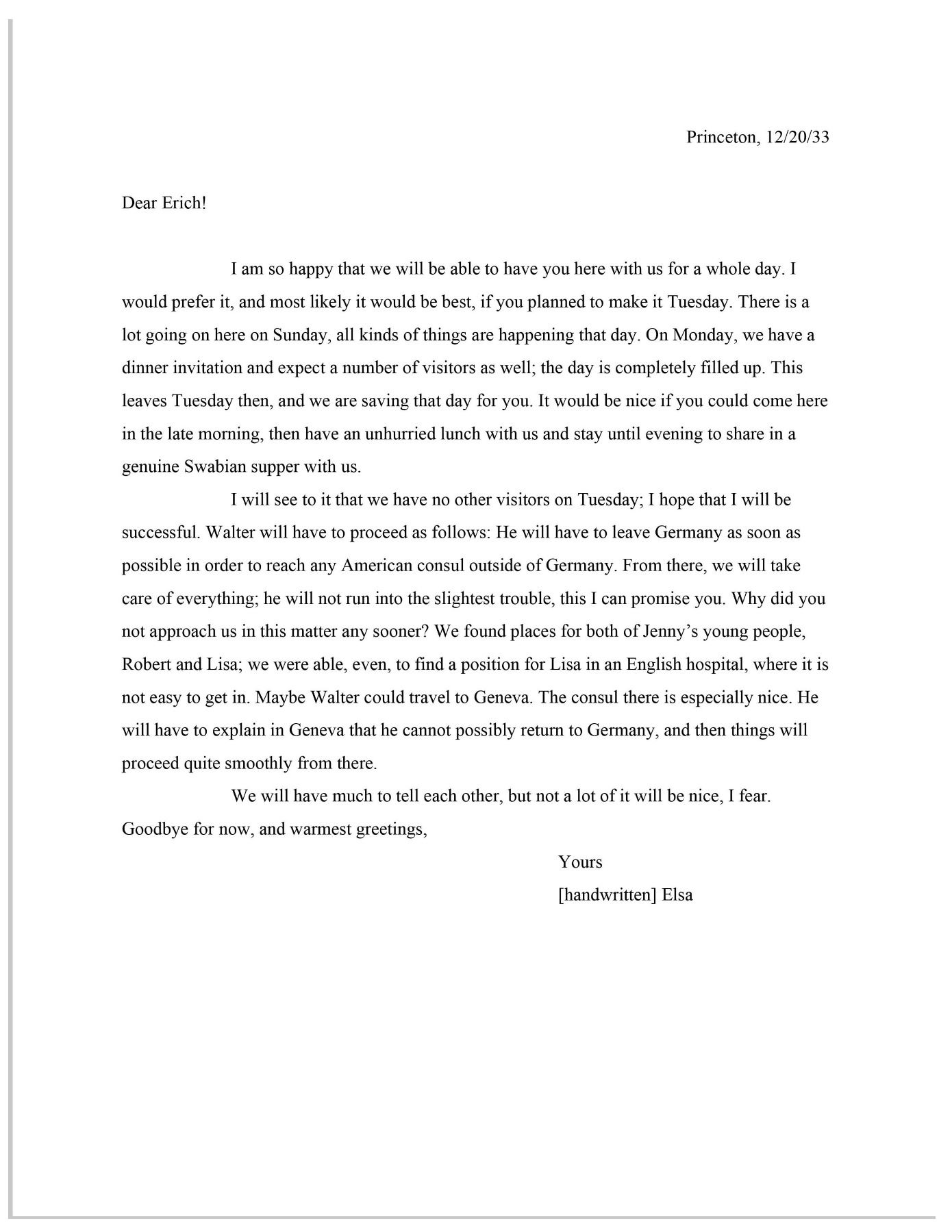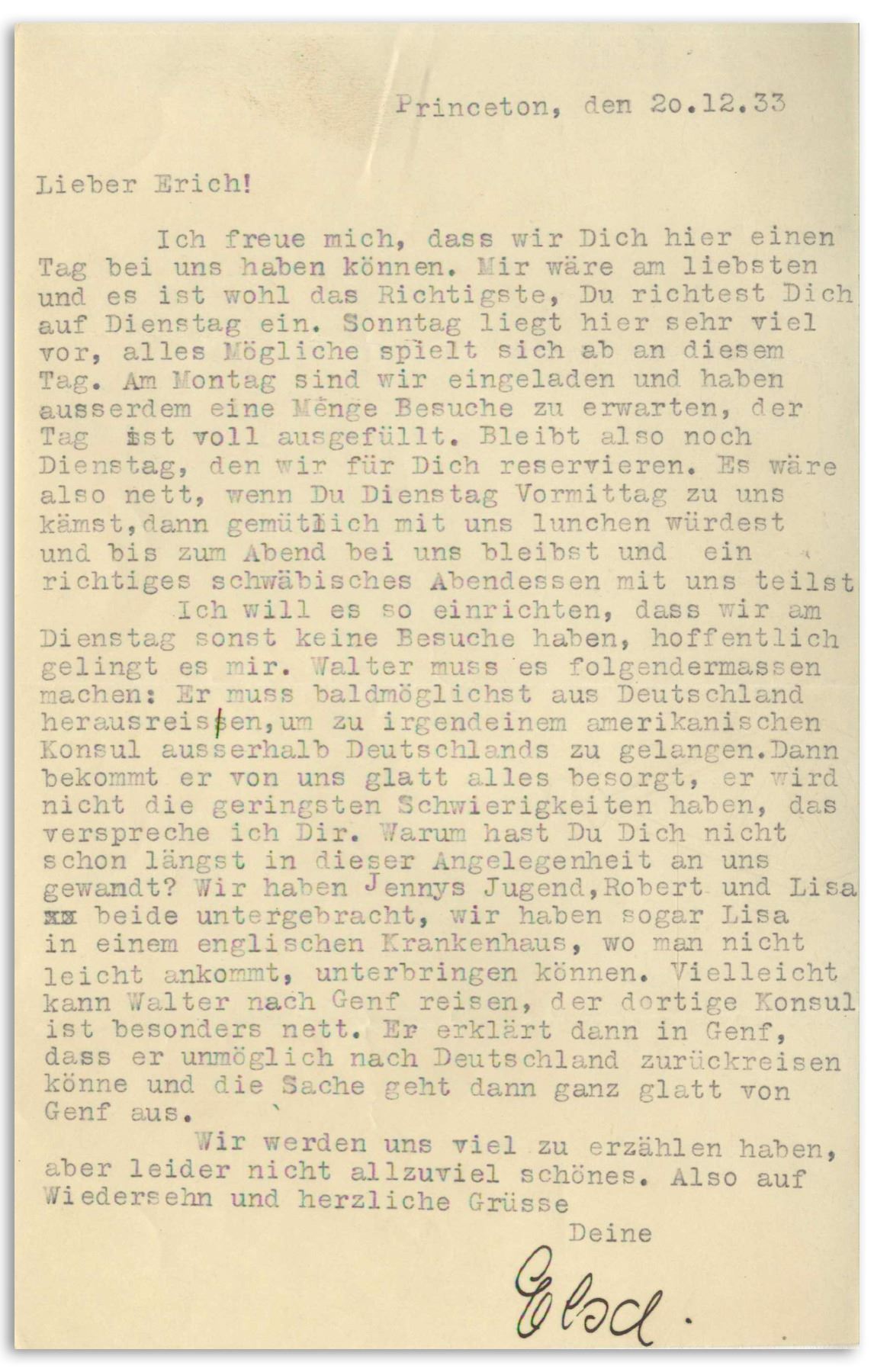 Elsa Einstein typed letter signed, composed on 20 December 1933 shortly after she and Albert Einstein moved to Princeton from Germany. Elsa writes to her cousin Erich, mentioning individuals in need of emigration from Germany during WWII. Letter in German translates in part, ''...On Monday, we have a dinner invitation and expect a number of visitors as well; the day is completely filled up. This leaves Tuesday then, and we are saving that day for you. It would be nice if you could come here in the late morning, then have an unhurried lunch with us and stay until evening to share in a genuine Swabian supper with us. / I will see to it that we have no other visitors on Tuesday; I hope that I will be successful. Walter will have to proceed as follows: He will have to leave Germany as soon as possible in order to reach any American consul outside of Germany. From there, we will take care of everything; he will not run into the slightest trouble, this I can promise you. Why did you not approach us in this matter any sooner? We found places for both of Jenny's young people, Robert and Lisa; we were able, even, to find a position for Lisa in an English hospital, where it is not easy to get in. Maybe Walter could travel to Geneva. The consul there is especially nice. He will have to explain in Geneva that he cannot possibly return to Germany, and then things will proceed quite smoothly from there. / We will have much to tell each other, but not a lot of it will be nice, I fear...[signed] Elsa.'' Single page letter measures 5'' x 8''. Shallow folds, overall near fine.