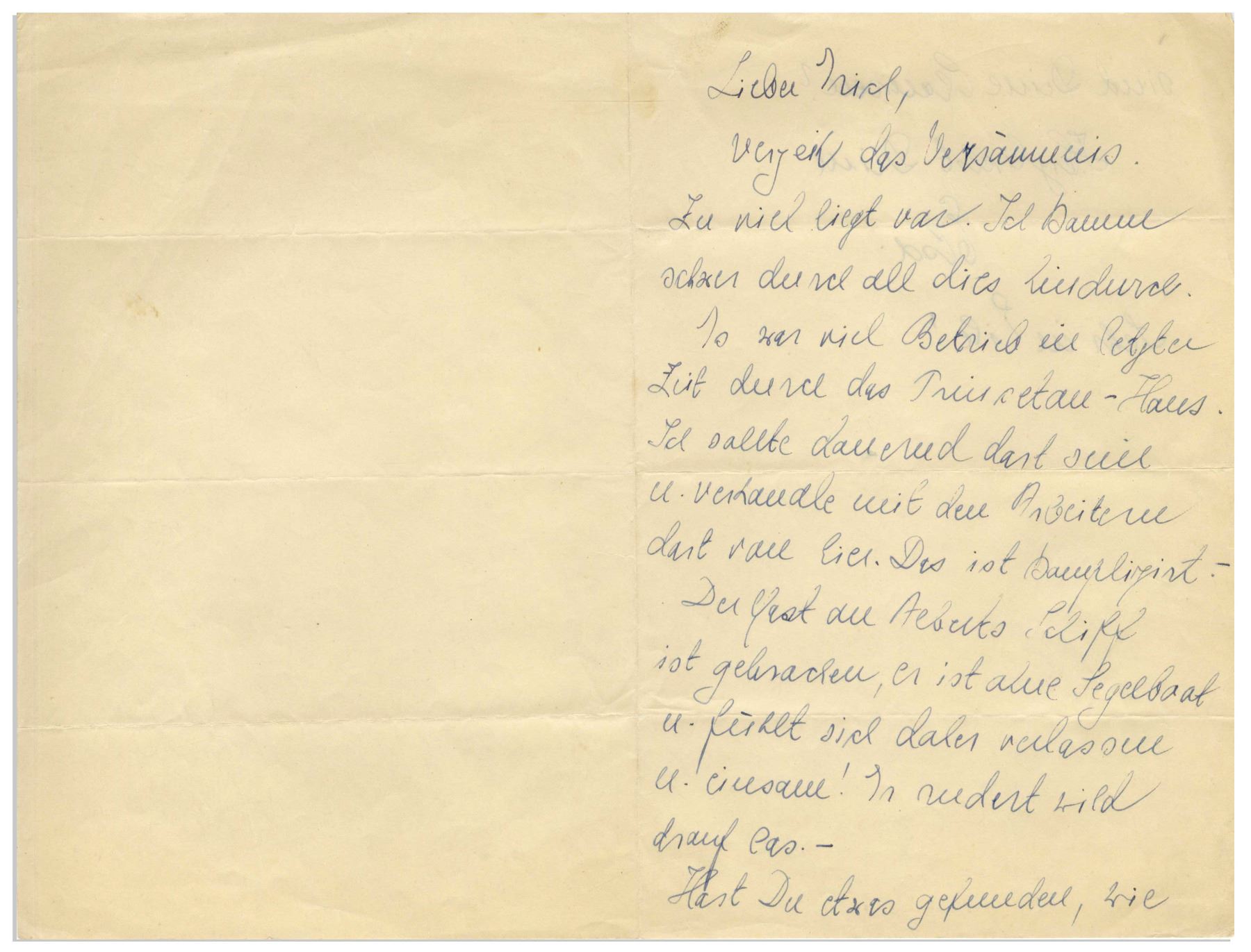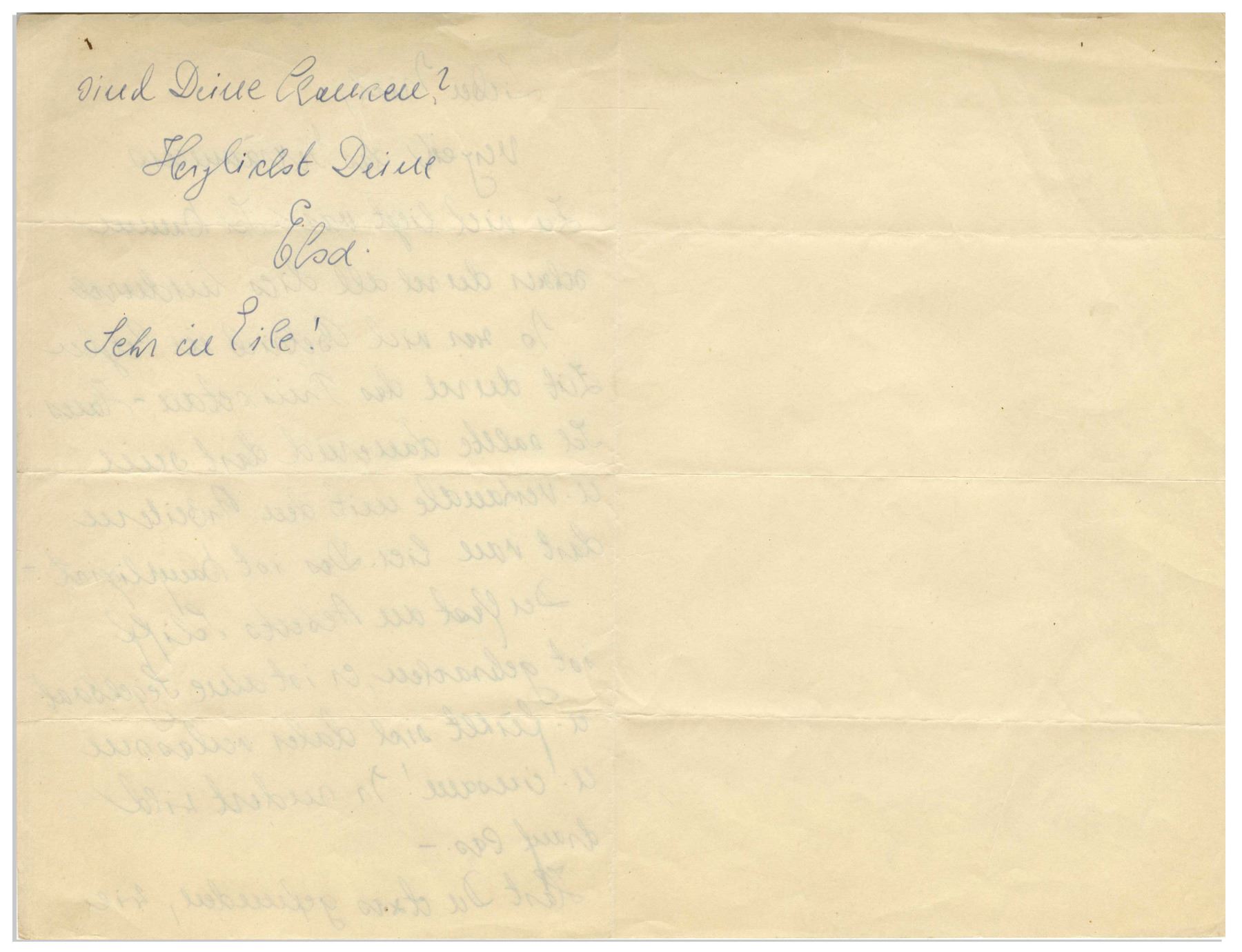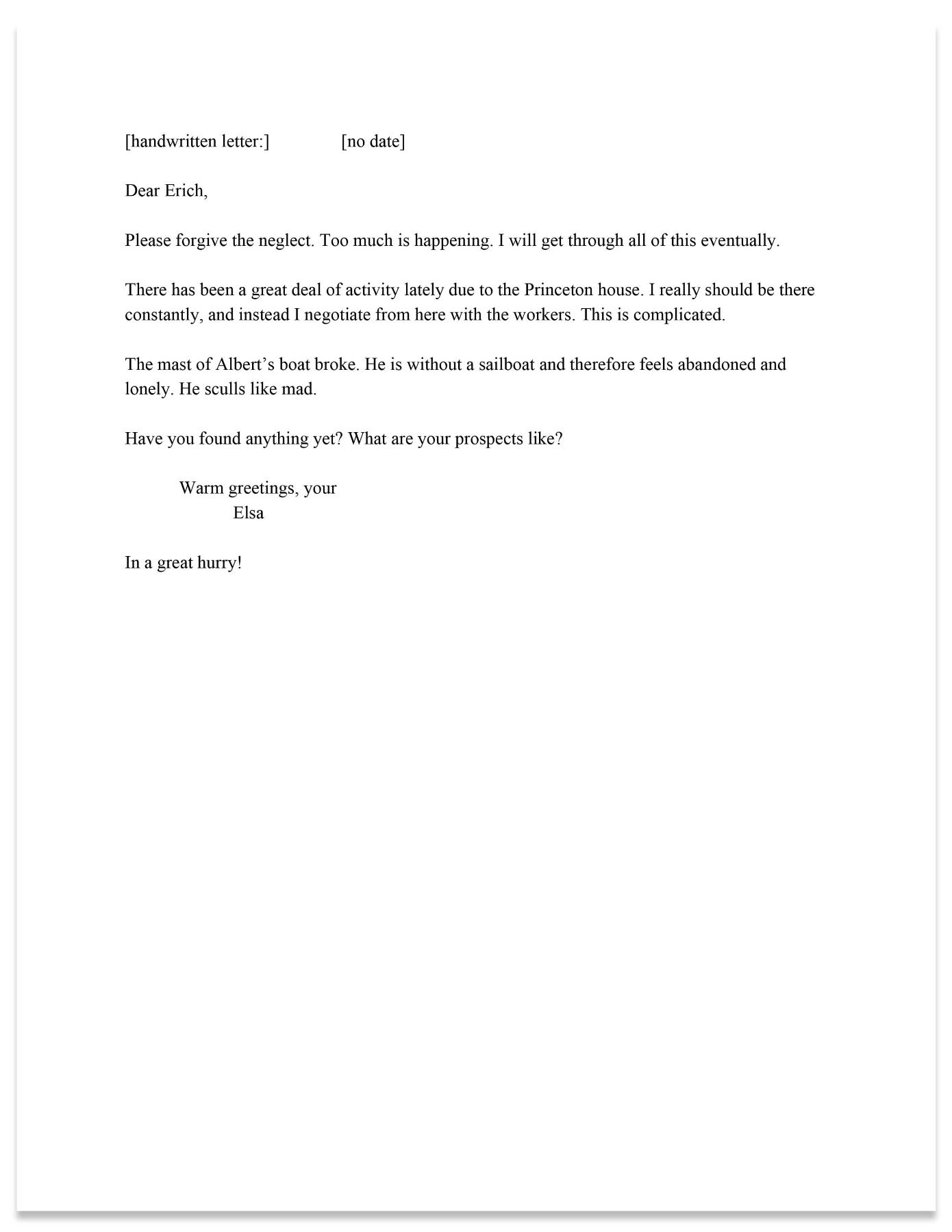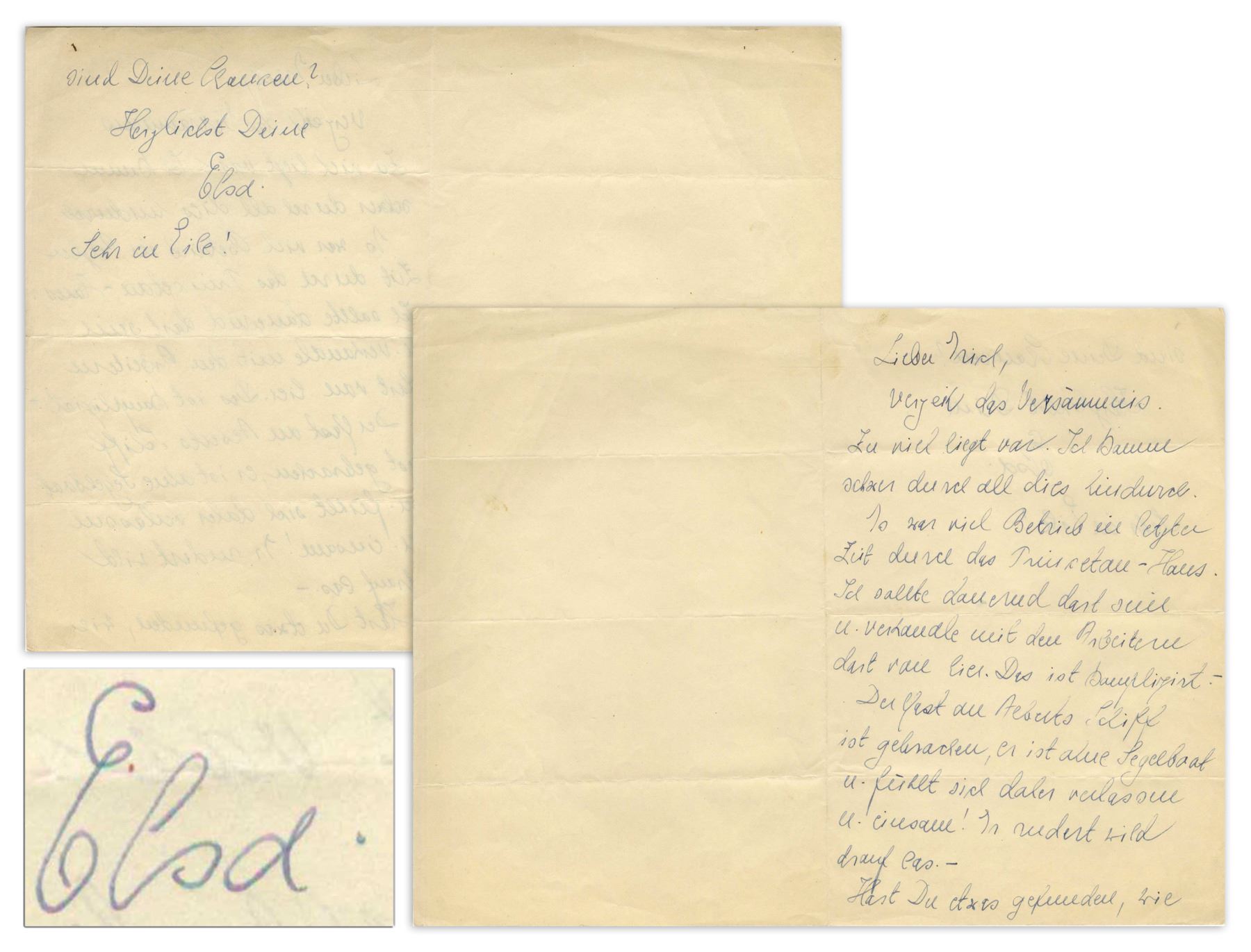 Letter in German translates in full, ''Please forgive the neglect. Too much is happening. I will get through all of this eventually. / There has been a great deal of activity lately due to the Princeton house. I really should be there constantly, and instead I negotiate from here with the workers. This is complicated. / The mast of Albert's boat broke. He is without a sailboat and therefore feels abandoned and lonely. He sculls like mad. / Have you found anything yet? What are your prospects like? / Warm greetings, your / Elsa / In a great hurry!'' Two page letter on bifolium stationery measures 11'' x 8.375'' unfolded. Light toning and wear, overall near fine condition. With full translation.