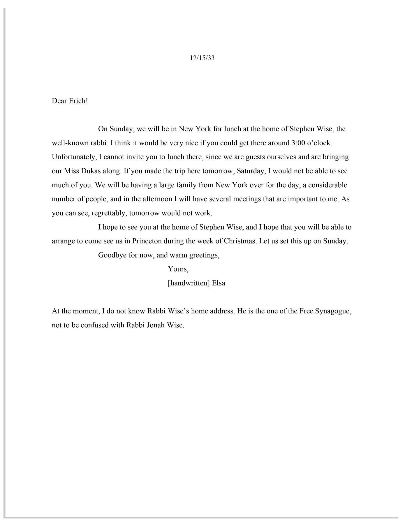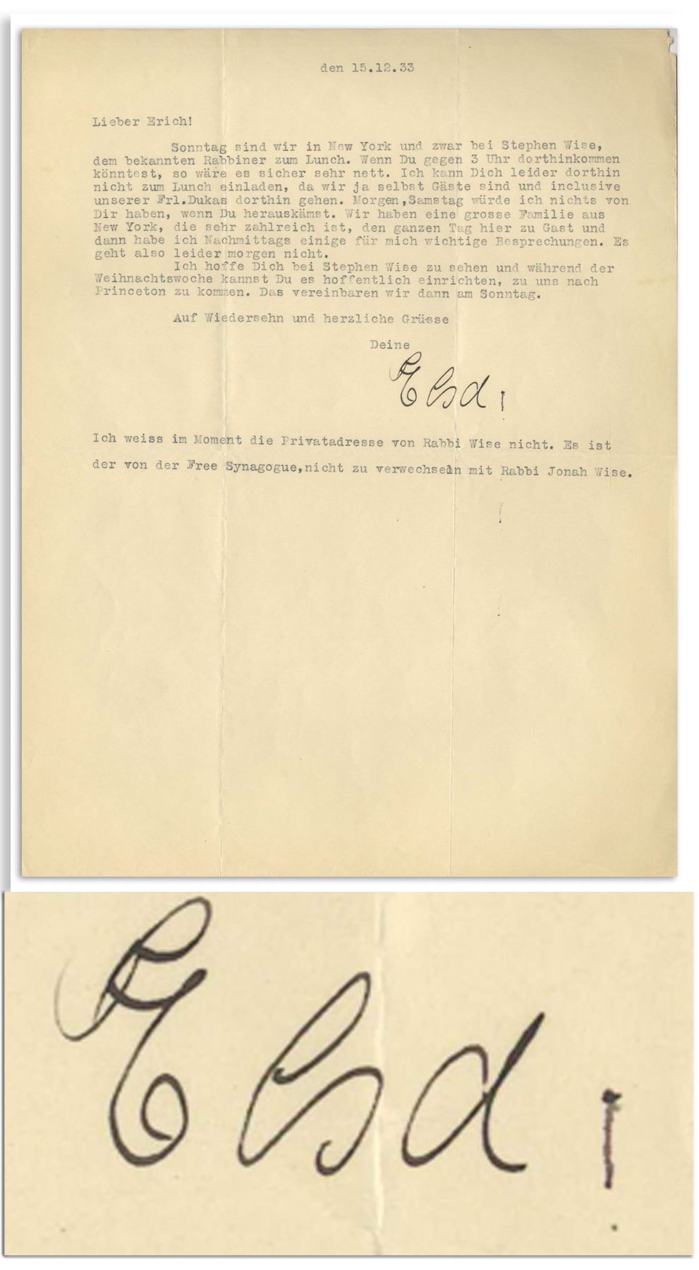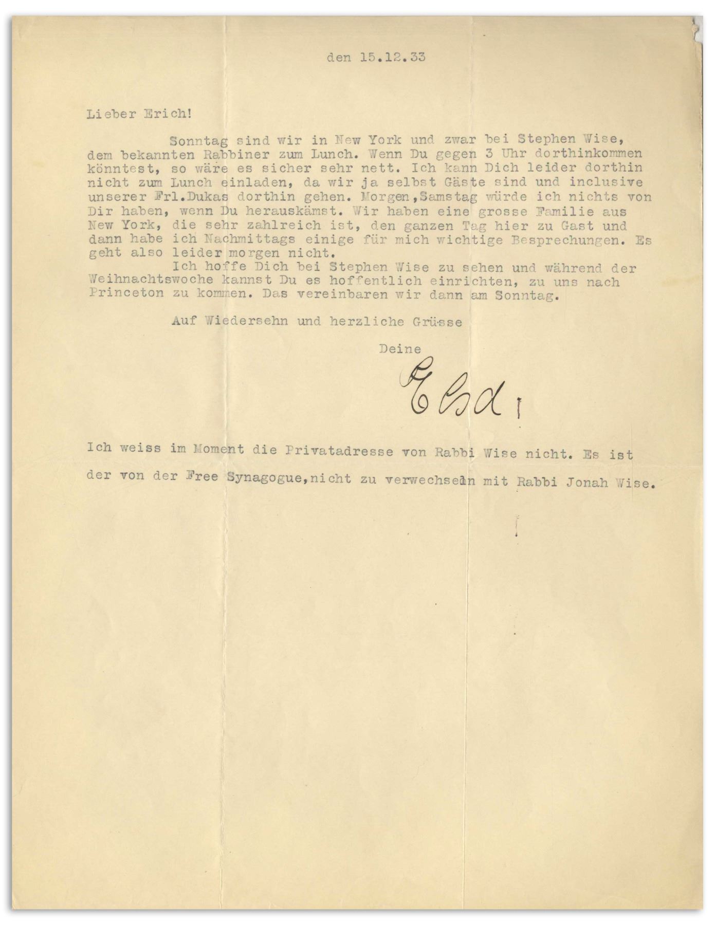 Elsa Einstein typed letter signed, dated 15 December 1933 shortly after she and Albert Einstein emigrated to the United States during World War II. Translated from German, Einstein writes to her cousin Erich, arranging a time to meet over the holidays. Letter reads in part, ''On Sunday, we will be in New York for lunch at the home of Stephen Wise, the well-known rabbi...Unfortunately, I cannot invite you to lunch there, since we are guests ourselves and are bringing our Miss Dukas along...Saturday...we will be having a large family from New York...[signed] Elsa...'' Single page letter measures 8.375'' x 11''. Folds and light wear, overall very good condition. With full translation.