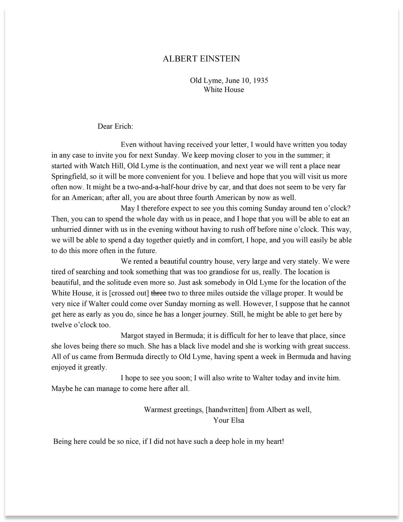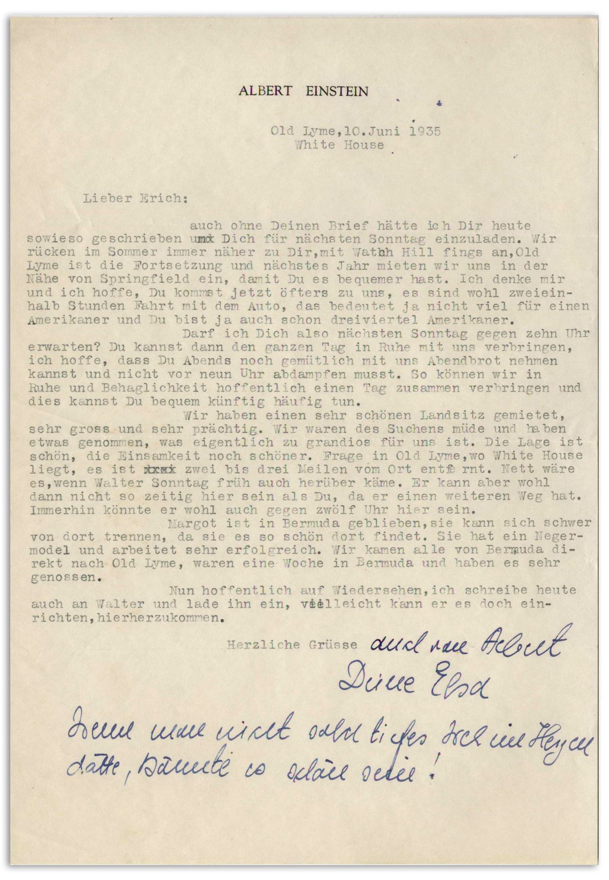 Elsa Einstein typed letter signed, composed upon her husband Albert Einstein's personal stationery. Writing from the ''White House'', their vacation home in Old Lyme, Connecticut on 10 June 1935, Elsa invites her cousin Erich for a visit. Letter translated from German reads in part, ''Even without having received your letter, I would have written you today in any case to invite you for next Sunday. We keep moving closer to you in the summer; it started with Watch Hill, Old Lyme is the continuation, and next year we will rent a place near Springfield, so it will be more convenient for you...