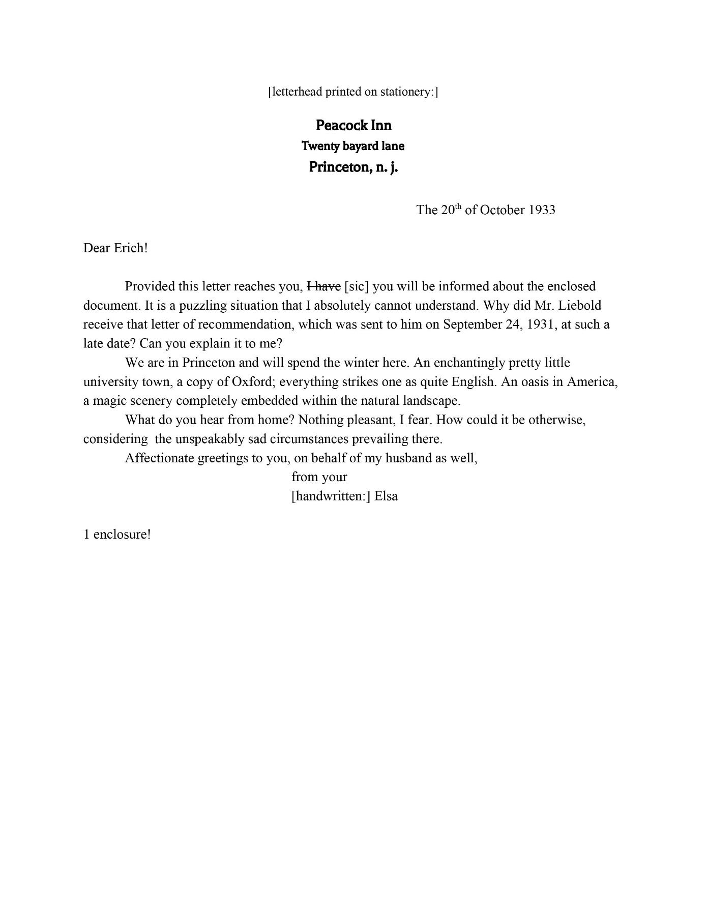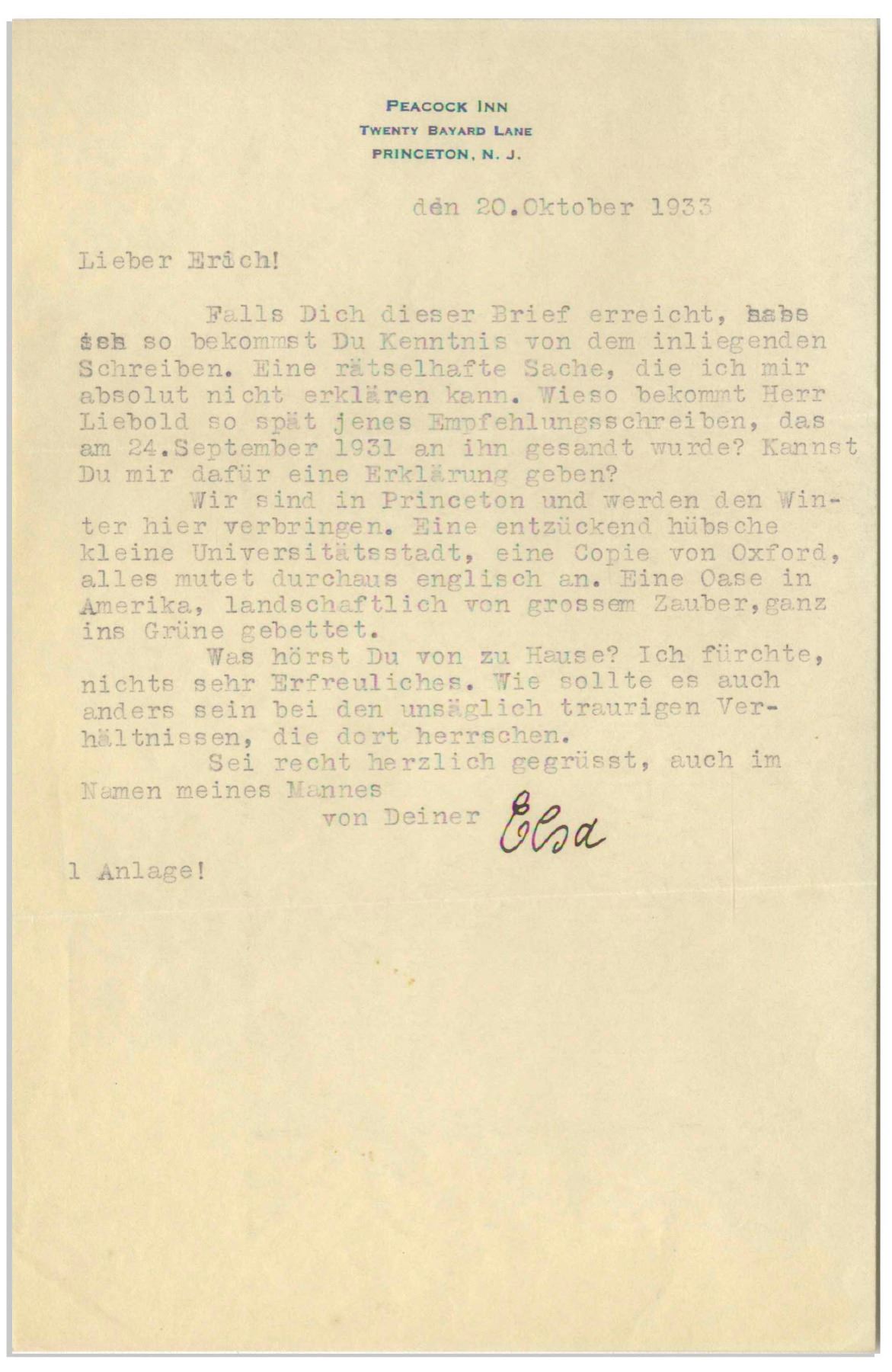 Elsa Einstein typed letter signed to her cousin Erich, praising the town of Princeton, New Jersey where the Einsteins moved after fleeing Germany. Datelined 20 October 1933 on stationery from the Peacock Inn in Princeton, German letter translates in part, ''...We are in Princeton and will spend the winter here. An enchantingly pretty little university town, a copy of Oxford; everything strikes one as quite English. An oasis in America, a magic scenery completely embedded within the natural landscape. / What do you hear from home? Nothing pleasant, I fear. How could it be otherwise, considering the unspeakably sad circumstances prevailing there. / Affectionate greetings to you, on behalf of my husband as well...[signed] Elsa''. Single page letter measures 5.5'' x 8.5''. Folds, overall near fine.