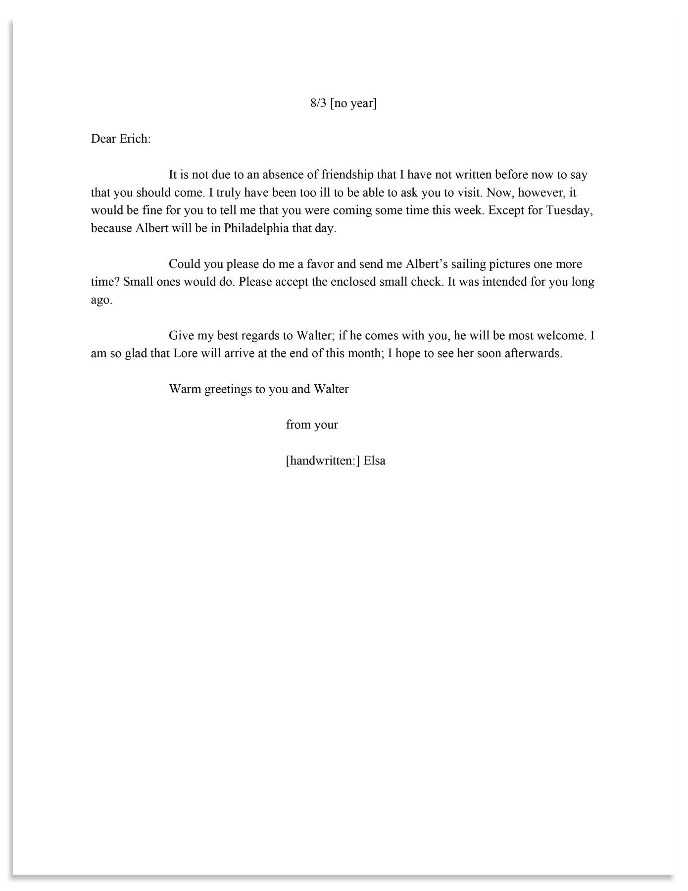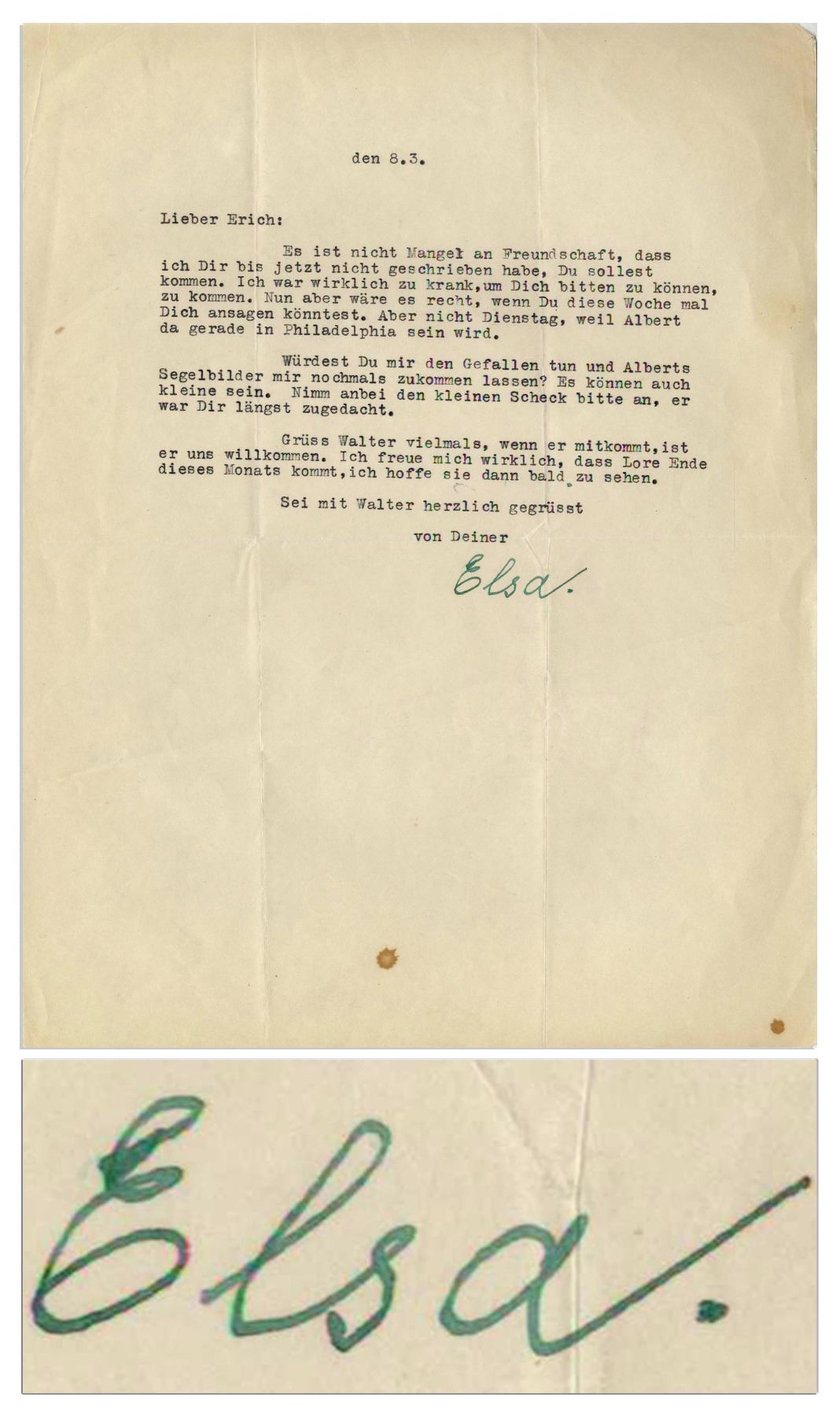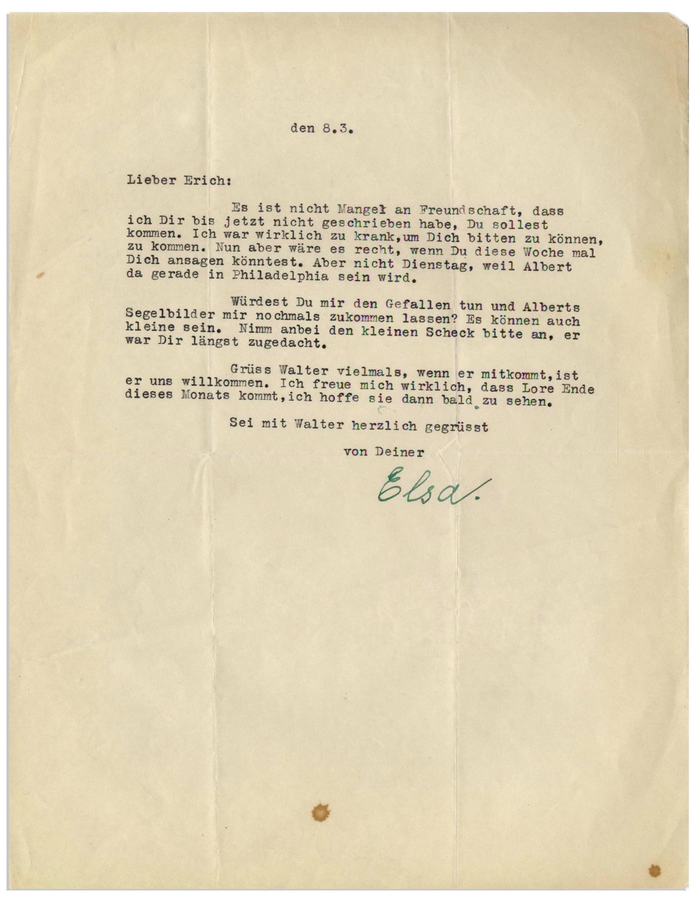 Elsa Einstein letter signed to her cousin Erich, undated but likely sometime in the late 1930s. In this letter, Elsa references Albert's sailing, and welcomes Erich's partner Walter into their home. Letter in German translates in part, ''It is not due to an absence of friendship that I have not written before now to say that you should come. I truly have been too ill to be able to ask you to visit. Now, however, it would be fine for you to tell me that you were coming some time this week. Except for Tuesday, because Albert will be in Philadelphia that day. / Could you please do me a favor and send me Albert's sailing pictures one more time? Small ones would do. Please accept the enclosed small check. It was intended for you long ago. / Give my best regards to Walter; if he comes with you, he will be most welcome. I am so glad that Lore will arrive at the end of this month; I hope to see her soon afterwards. / Warm greetings to you and Walter...[signed] Elsa''. Single page letter measures 8.5'' x 11''. Folds, and a few spots of discoloration, overall very good condition.