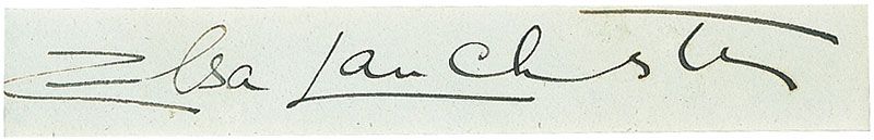 Vintage fountain pen signature, “Elsa Lanchester,” on a light blue slip. Matted with a photo of Lanchester from The Bride of Frankenstein, to an overall size of 8 x 10. In fine condition.