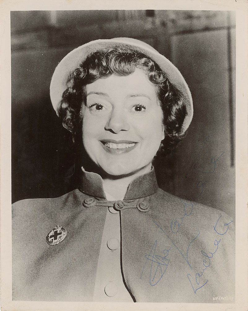 Glossy 8 x 10 photo of Lanchester posing outdoors, signed in blue ballpoint, “Elsa Lanchester,” adding her last name again underneath. In very good condition, with creasing to top edge, a few other creases, contrast to last name of signature, and adhesive remnants to reverse.