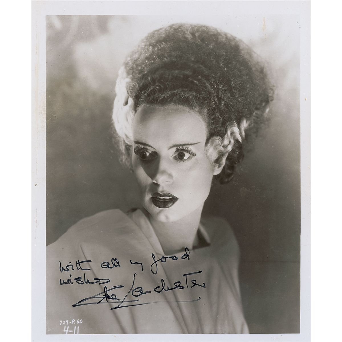 Iconic glossy 8 x 10 photo of Lanchester in The Bride of Frankenstein, signed in black felt tip, “With all my good wishes, Elsa Lanchester.” In fine condition, with scattered spotting and surface impressions.