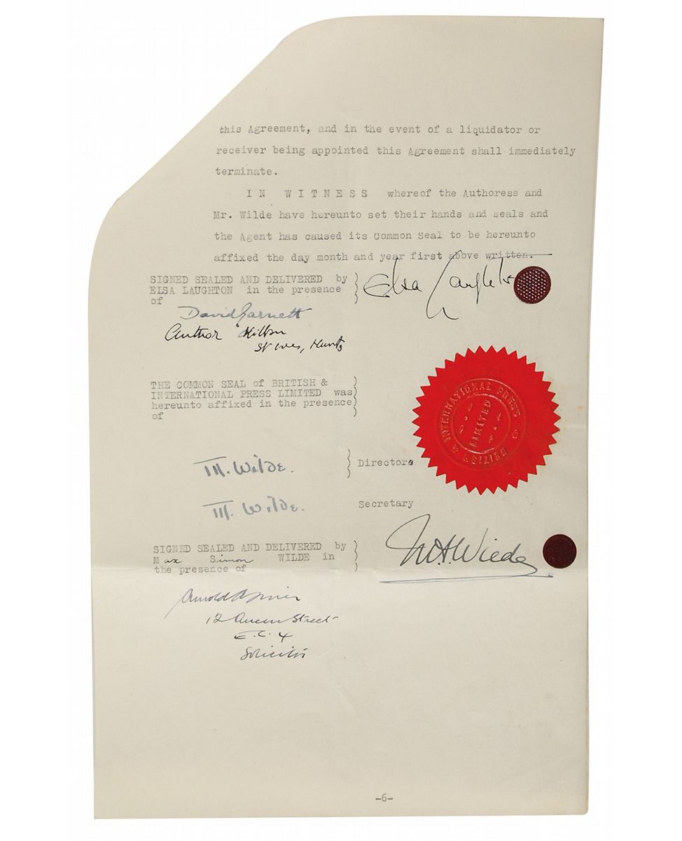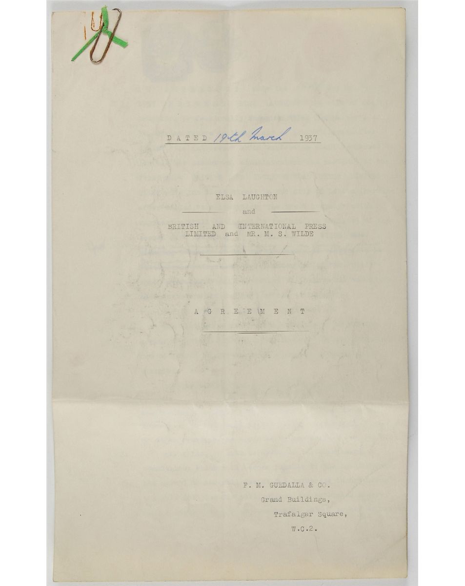 English character actress (1902–1986) most widely recognized for her role as the title character in Bride of Frankenstein. DS, signed “Elsa Laughton,” six pages, 8 x 13, March 19, 1937. An agreement between Lanchester and British and International Press Limited. In part: “Between Elsa Laughton the wife of Charles Laughton, professionally known as ‘Elsa Lanchester’…the hereinafter called ‘the Authoress’…[and] British and International Press Limited…It is hereby agreed as follows…The Authoress shall write or cause to be written a series of articles…not to exceed 30,000 words on a subject provisionally entitled: ‘Charles Laughton and I’ By Elsa Lanchester (Mrs. Charles Laughton).” Signed at the conclusion in fountain pen by Lanchester using her married name, and countersigned by several witnesses and representatives. In fine condition, with expected document wear and a rusty paperclip to upper left.