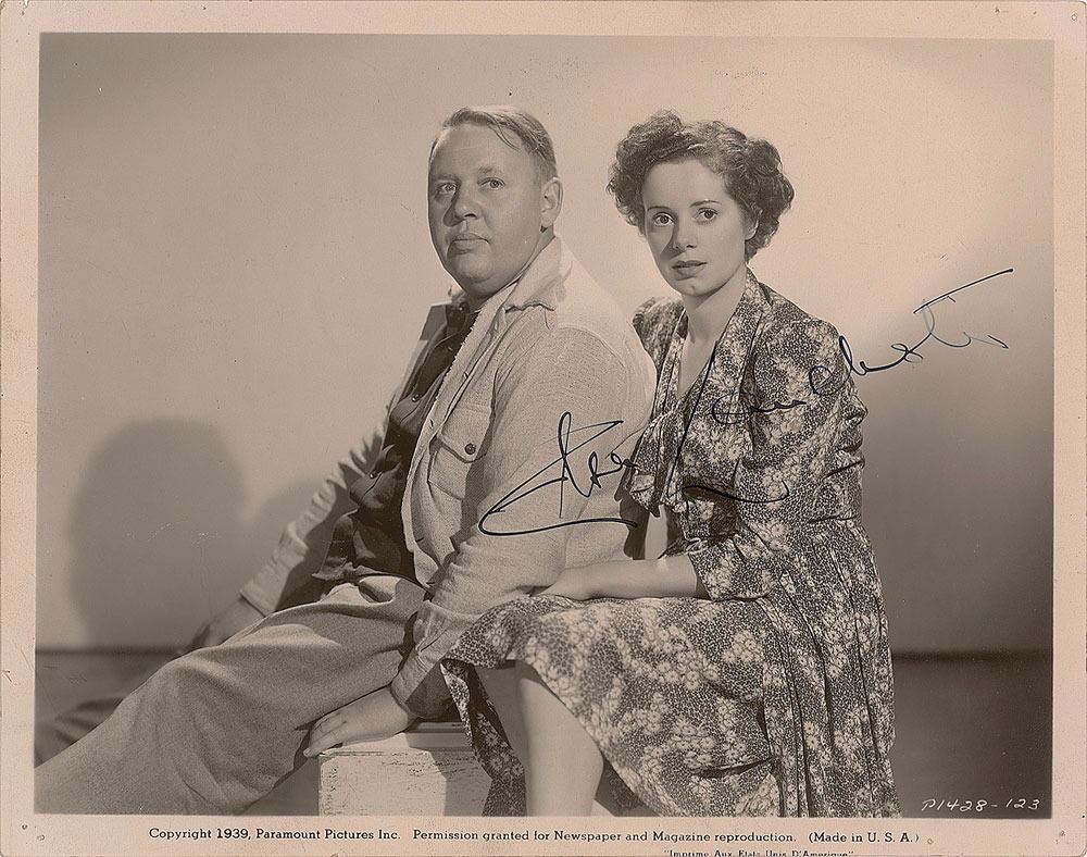 Vintage glossy 10 x 8 Paramount Pictures publicity photo of Lanchester in a seated pose with her husband Charles Laughton, signed in fountain pen by Lanchester. In fine condition, with tack holes to corners.