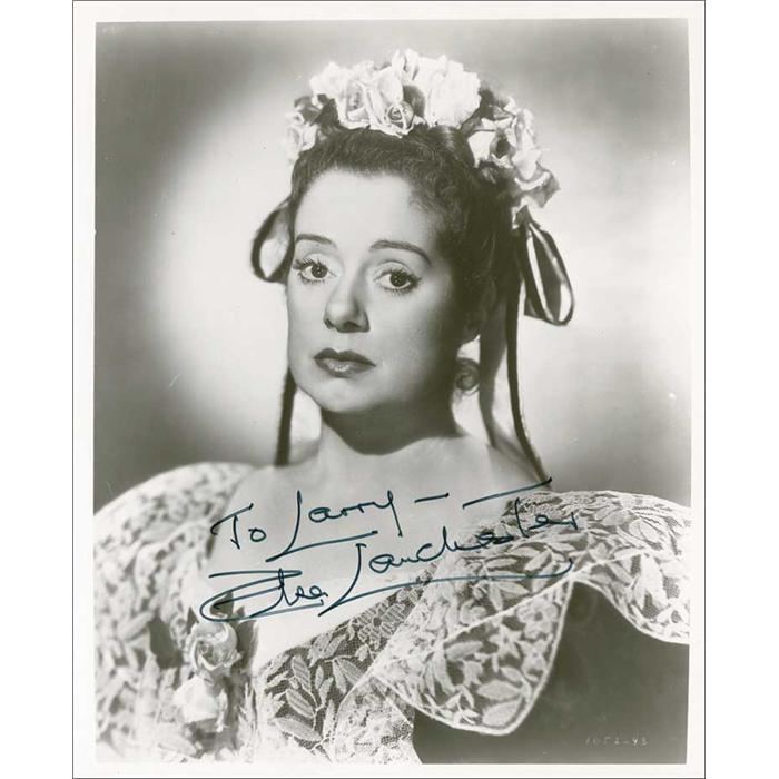 Glossy 8 x 10 photo of the actress in a period costume, signed and inscribed in black felt tip “To Larry—Elsa Lanchester.” In very fine condition. Pre-certified PSA/DNA and RRAuction COA.