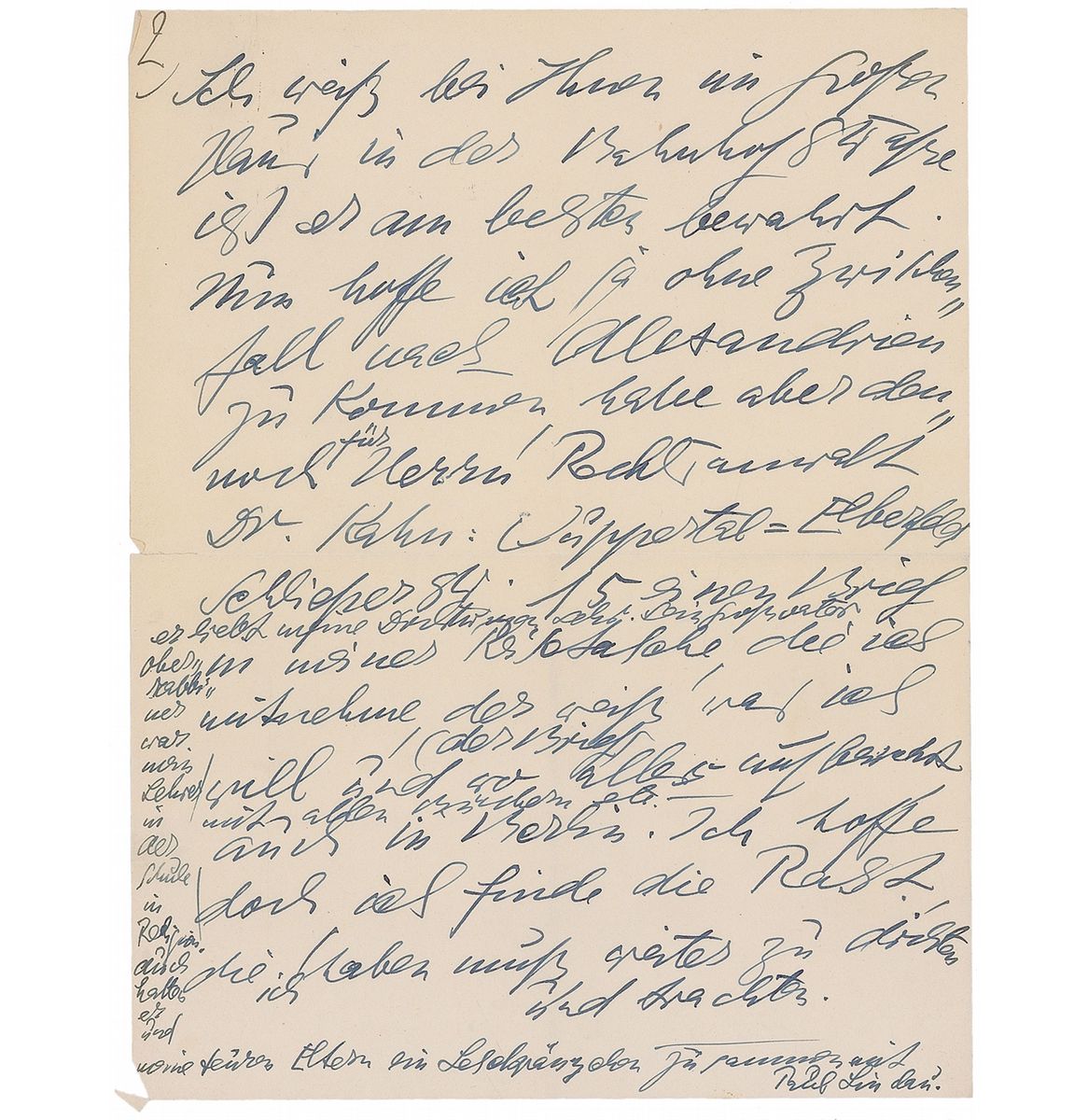 Jewish poet and playwright (1869–1945) famous for her bohemian lifestyle in Berlin, who later fled Nazi Germany for Zurich before settling in Jerusalem. Scarce partial ALS in German, unsigned, one page, 8.25 x 10.75, no date but likely circa 1938–1939. The second page of what was a longer letter. In part (translated): “Well I hope to come without incident to Alexandria, but still the attorney for Dr. Kahn…a letter in my bag that I take with me who knows what I want and where everything is stored with all the books etc. I do hope I find the rest, I must have to continue seeking…His grandfather the Chief Rabbi was my religion teacher at school.” In fine condition.