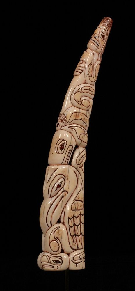 Elsie John Carved Walrus Tusk Depicting Shaman Holding Whale and a Raven with Faceted Garnet Inset Eyes 12 1/2" L. Fine Condition NOT ALLOWED TO SHIP OUTSIDE CANADA
