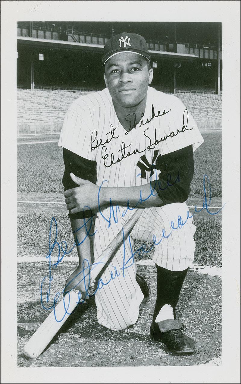 The first African American player on the Yankees roster, he was named the American League’s Most Valuable Player in 1963. Glossy 3.5 x 5.5 photo of Howard posing in his Yankee pinstripes, signed in blue ballpoint, “Best wishes, Elston Howard.” Photo also bears a pre-printed signature and sentiment. In fine condition.