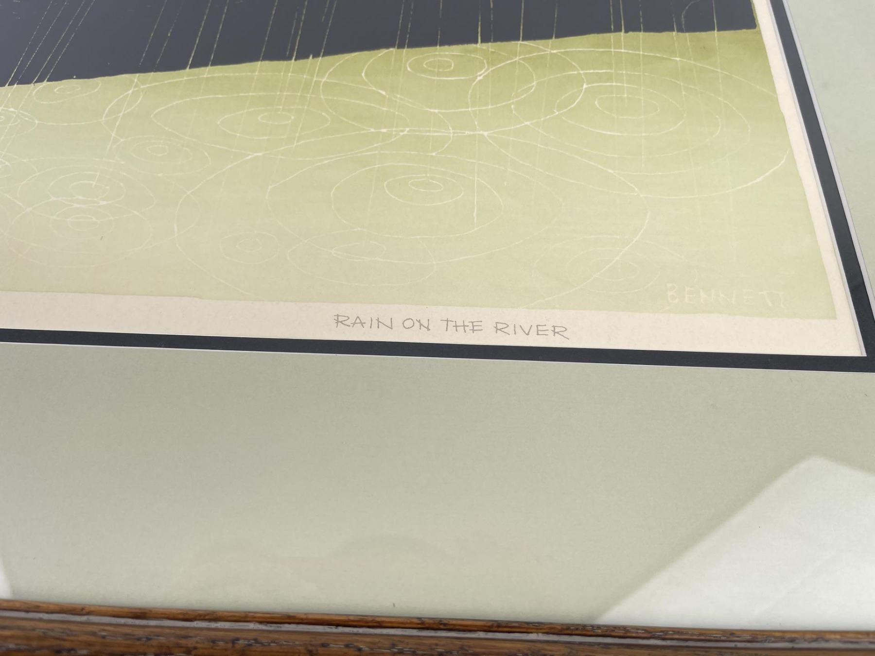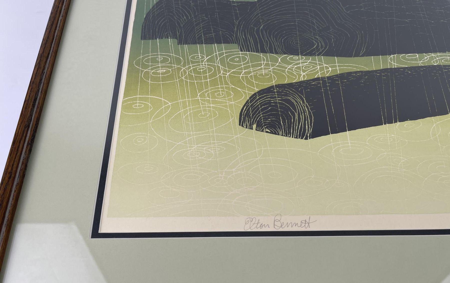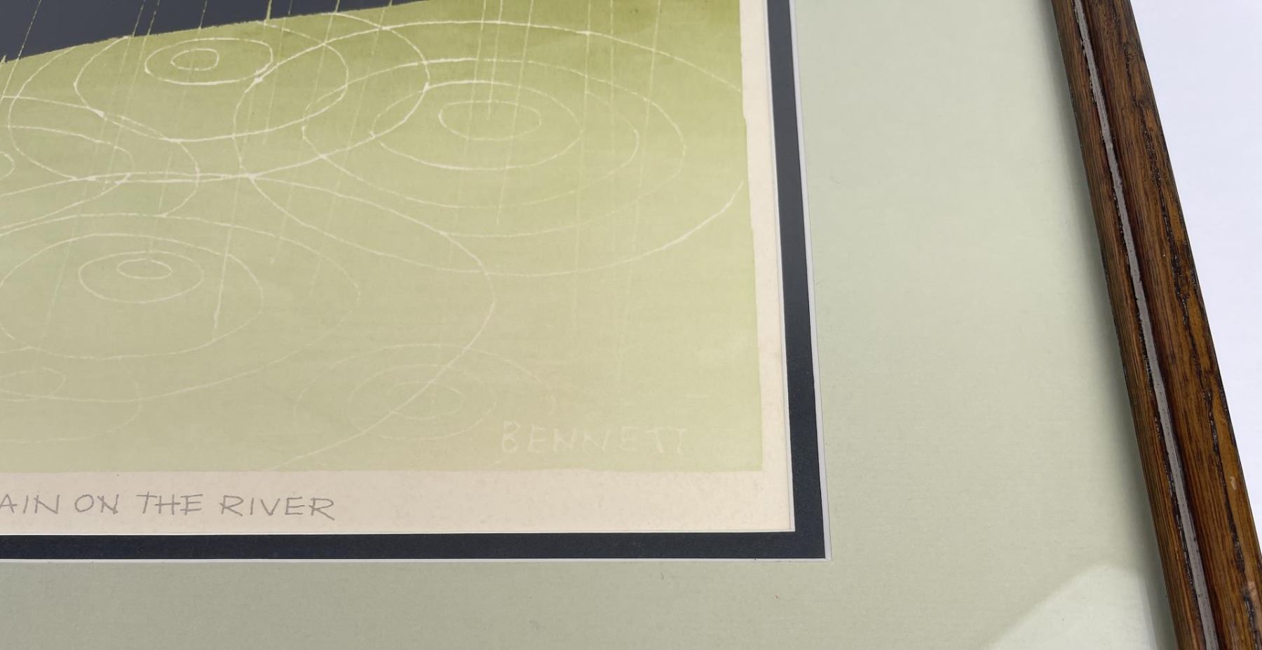 Serigraph 25.25" by 31" framed. Elton Bennett (1910-1974) was a lifelong native of Grays Harbor. One look at his luminous silkscreen art work is enough to inform the viewer of his deep and enduring love for everything that Grays Harbor has to offer- our grey days, the abundance of rainfall, the brisk scent of salt air, the rivers, beaches, and waterways. My memories of my father always conjure the image of an artist reaching for sketch book and pen, a delighted expression of coming upon yet another scene he needed to record. Weekends were spent as a family exploring places which would later appear in a finished print. The early years were a difficult time, as he struggled to establish himself as an artist. He had no desire to leave home in order to fit in with the Seattle art community. The inspiration for his art was always here, and here he would stay, even if it meant putting his talent to use screening labels for cans of clam chowder. Which he did! There were also bumper stickers for the Westport Salmon Derby, menu covers for Sourdough Lils, motel brochures, and paper placemats.