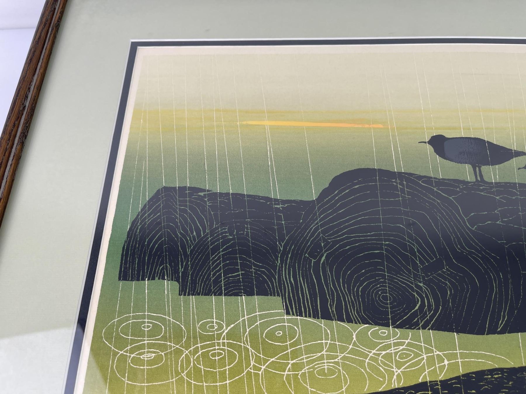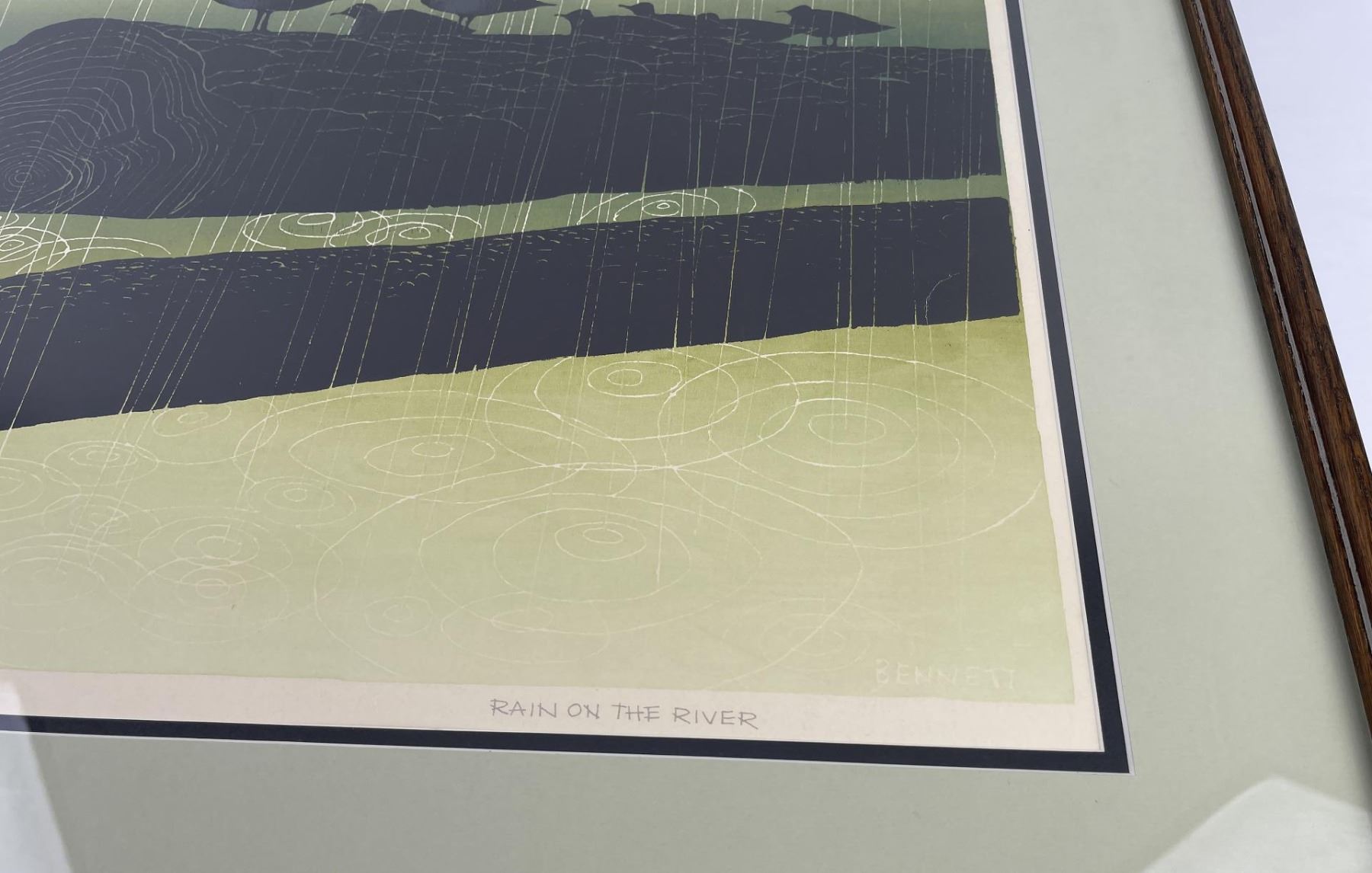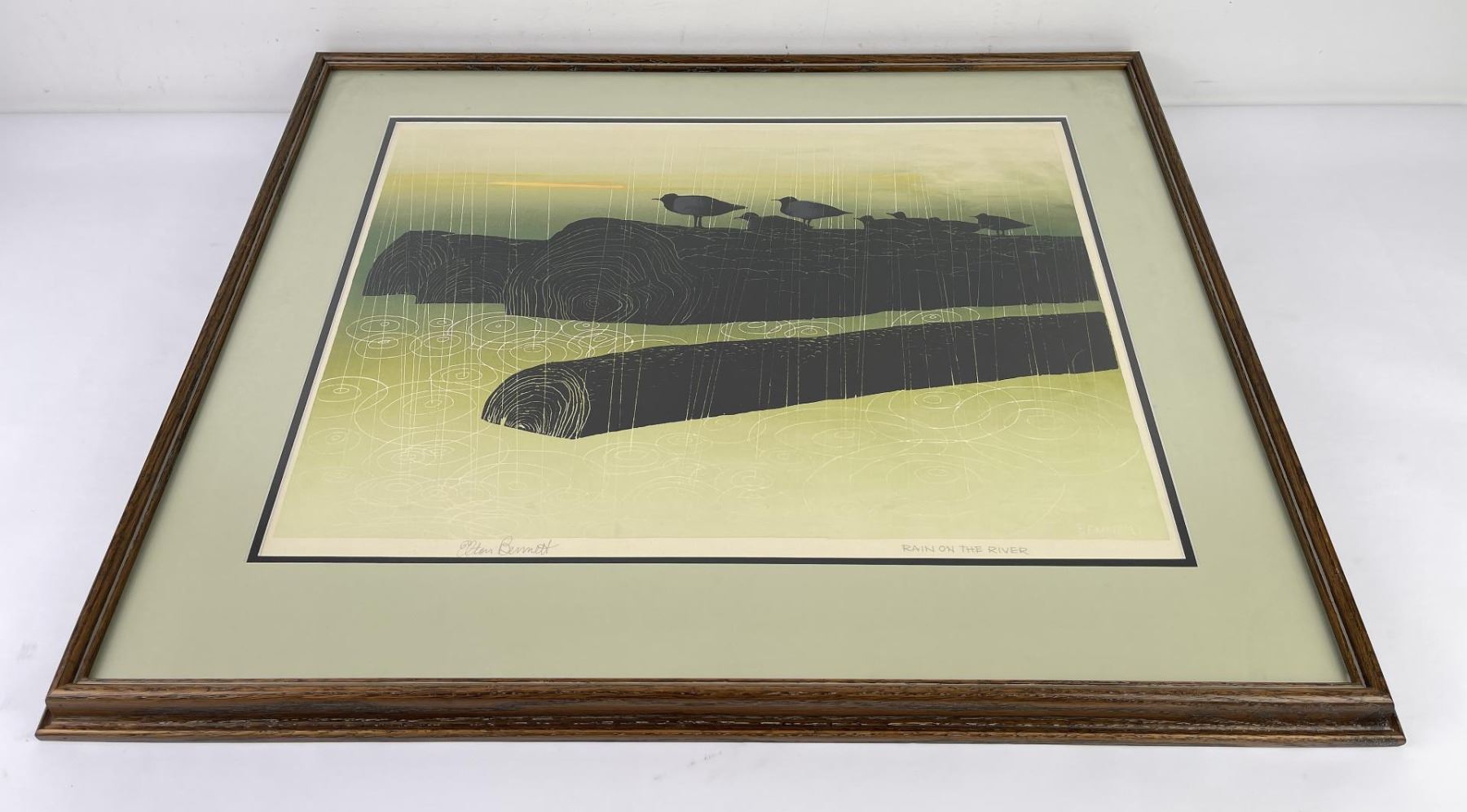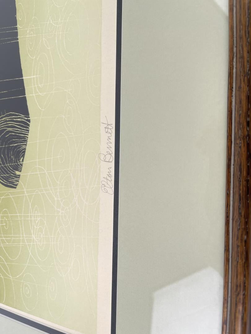 Serigraph 25.25" by 31" framed. Elton Bennett (1910-1974) was a lifelong native of Grays Harbor. One look at his luminous silkscreen art work is enough to inform the viewer of his deep and enduring love for everything that Grays Harbor has to offer- our grey days, the abundance of rainfall, the brisk scent of salt air, the rivers, beaches, and waterways. My memories of my father always conjure the image of an artist reaching for sketch book and pen, a delighted expression of coming upon yet another scene he needed to record. Weekends were spent as a family exploring places which would later appear in a finished print. The early years were a difficult time, as he struggled to establish himself as an artist. He had no desire to leave home in order to fit in with the Seattle art community. The inspiration for his art was always here, and here he would stay, even if it meant putting his talent to use screening labels for cans of clam chowder. Which he did! There were also bumper stickers for the Westport Salmon Derby, menu covers for Sourdough Lils, motel brochures, and paper placemats.