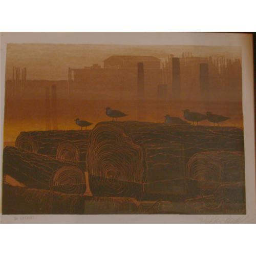 Fine Elton Bennett the Watchers. Shows some water spotting but is under glass on acid free paper and is out of the sunlight. Measures 20 x 26. This piece is appraisal priced at $ 1,199.00. Elton Bennett (1910-1974) grew up on the Washington coast, where mill work, fishing and dredging are common occupations. He spent many years working along the shore. Until his marriage in 1946, Bennett was discouraged from pursuing his love of art. He had very little formal training?a year at Washington State when he was 17 and two years after World War II on the G.I. bill at the Portland Art Museum School. Working several jobs, he finally saved enough money to pursue his dream in 1956. Elton Bennett chose silkscreen printing for his medium. He would always use a great number of screens and colors in infinite combinations so that each finished serigraph was a unique work of art. Bennett?s serigraphs depict the Pacific Northwest coastal environment and give glimpses of the working lives of the people the artist knew and worked with all his life.