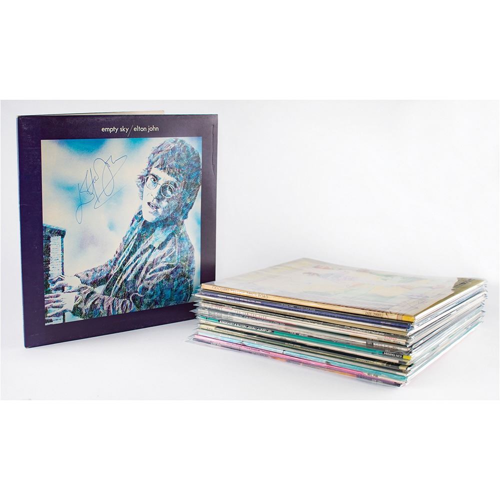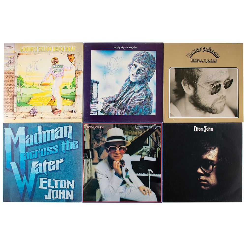 Marvelous collection of 24 albums by Elton John, consisting of his first 21 studio albums and first three compilation albums, all of which have been signed on the front cover in blue ballpoint by the award-winning musician. All of the records are included. The album titles, in chronological order, are as follow: Empty Sky; Elton John; Tumbleweed Connection; Madman Across the Water; Friends soundtrack; Honkey Chateau; Don’t’ Shoot Me I’m Only the Piano Player; Goodbye Yellow Brick Road; Caribou; Greatest Hits; Captain Fantastic and the Brown Dirt Cowboy; Rock of the Westies; Blue Moves; Greatest Hits Volume II; A Single Man; Victim of Love; 21 at 33; Lady Samantha; The Fox; Jump Up!; Two Low for Zero; Breaking Hearts; Ice On Fire; and Leather Jackets. In overall fine condition.