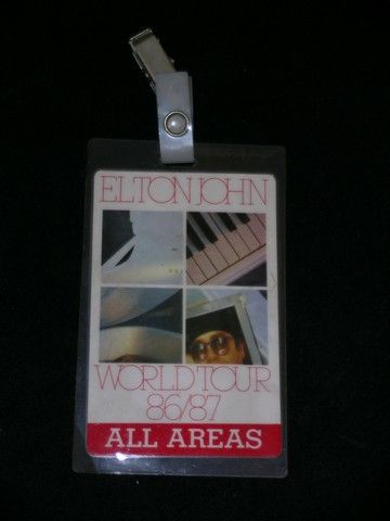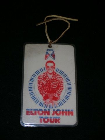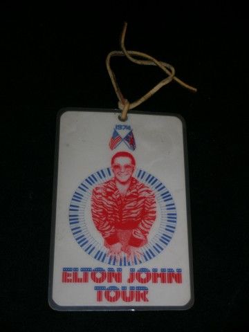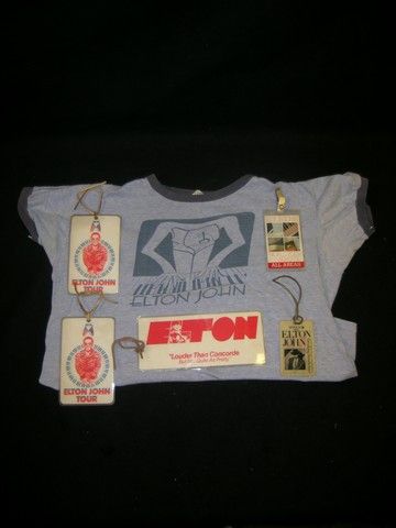 From possibly the greatest living entertainer, a collection of Elton John concert passes and T-shirt. The lot consists of an Elton John grey 'College Lane' T-shirt (size XL), an Elton John/Sasson 'Breaking Hearts Tour' backstage pass (measures approx. 4" x 2 1/2"), an Elton John 'All Areas World Tour 86/87' Backstage Pass (measures approx. 3" x 5"), a pair of '1974 Elton John Tour' passes for Jim Morris (approx. 6 1/2" x 4 ea."), and an Elton John "Louder Than Concorde But Not Quite As Pretty' backstage pass with the number '21' printed on the reverse. (measures approx. 9 1/4" x 4")
